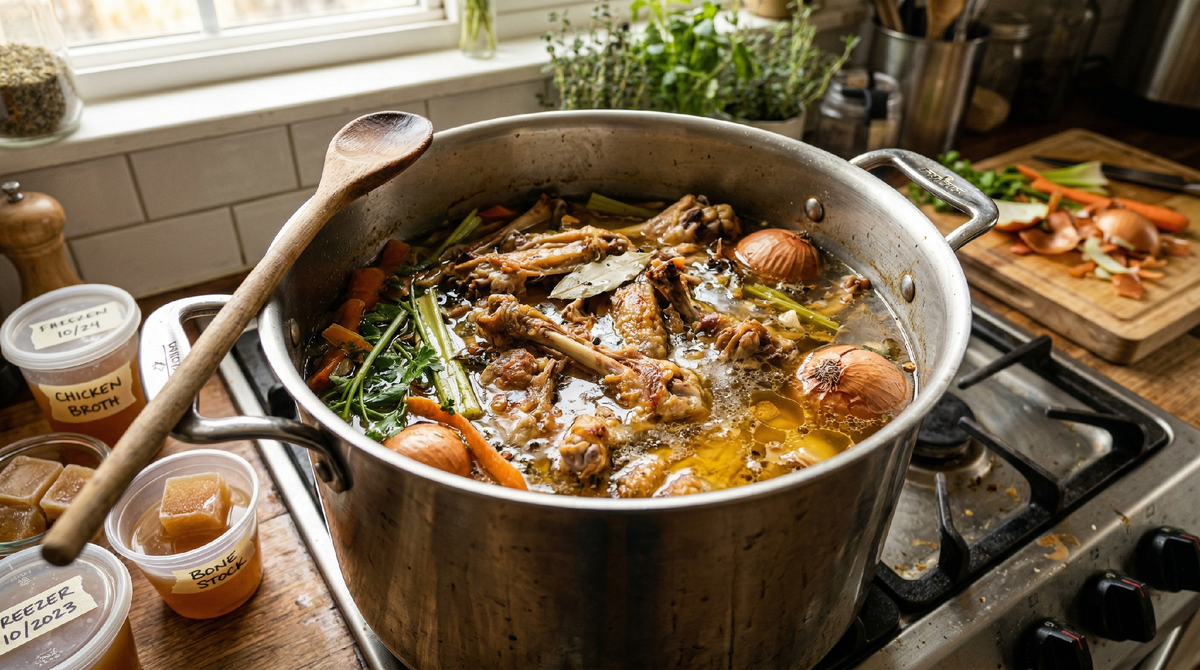 Когда-то я выбрасывала куриные кости после разделки тушки и даже не задумывалась, что из них можно приготовить что-то стоящее. Очистки от моркови, луковая шелуха, хвостики от сельдерея — всё это летело в мусорное ведро без малейших угрызений совести. Так продолжалось до тех пор, пока однажды свекровь не увидела, как я выкидываю куриный каркас после того, как сняла с него всё мясо для салата. Она посмотрела на меня с таким выражением лица, будто я только что выбросила в помойку золотые часы. «Ты что творишь?» — спросила она. И дальше последовала лекция минут на сорок о том, как правильная хозяйка распоряжается продуктами.