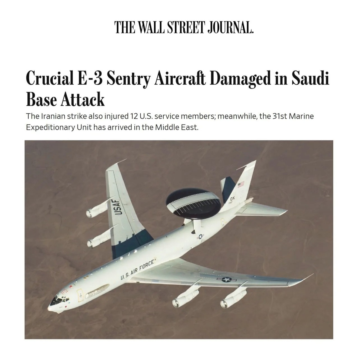 ▪️Самолет был поражен иранской ракетой на базе Принц Султан в Саудовской Аравии. ▪️В результате удара также получили ранения 12 американских военнослужащих. ▪️E-3 Sentry — это самолет ДРЛО, который помогает управлять полем боя и отслеживать беспилотники, ракеты и самолеты на расстоянии сотен километров. Он предоставляет командирам картину боевых действий в режиме реального времени и позволяет им направлять средства для перехвата угроз, а также управлять дружественными самолетами. МАХ maxgate.io/forpestZ Телеграм https://t.me/forpestZ