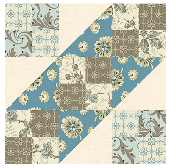 Седьмой блок радует нас изящной геометрией и ритмичным рисунком. В нём сочетаются простые квадраты, блоки «Четыре квадрата» (Four Patch) и "Треугольник в полквадрата" (HST). Блок собирается из нескольких повторяющихся элементов, что делает его удобным для конвейерной сборки.