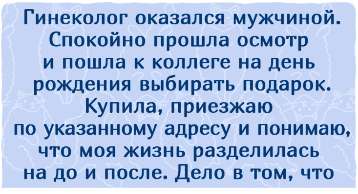 - Гинеколог оказался мужчиной, спокойно прошла осмотр и отправилась домой. На вечер было запланировано мероприятие: коллега пригласила на день рождения. Купив подарок, отправилась по указанному адресу, и все... моя жизнь разделилась на до и после. Дверь открыл он, муж моей коллеги, тот самый гинеколог. Я понимаю, что у врачей нет пола, но весь вечер мне было так неловко!