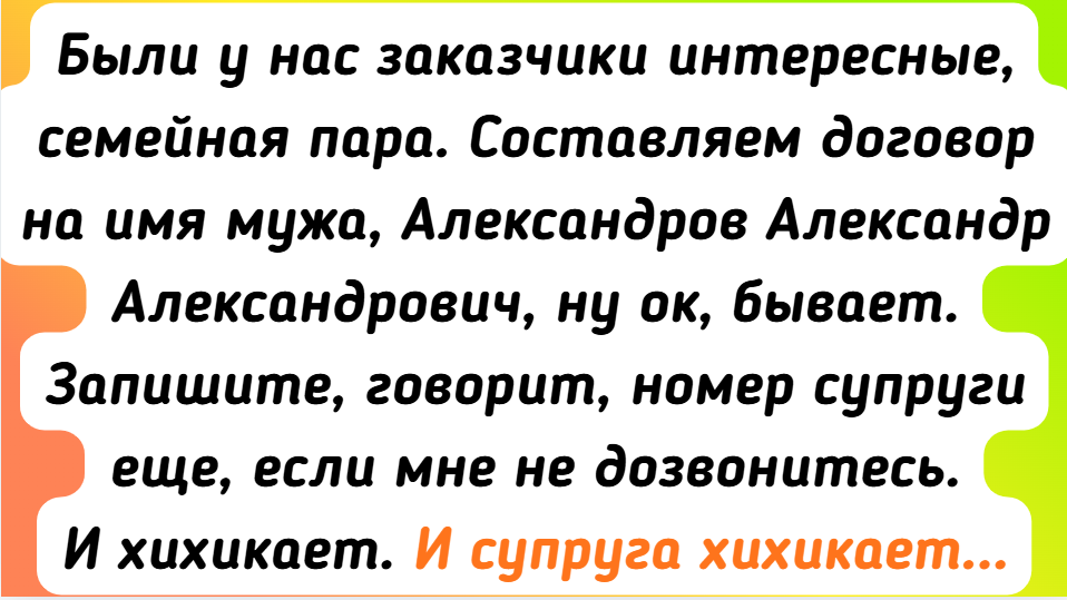 - Были у нас заказчики интересные, семейная пара. Составляем договор на имя мужа, Александров Александр Александрович, ну ок, бывает. Запишите, говорит, номер супруги еще, если мне не дозвонитесь. И хихикает. И супруга хихикает, называя номер: «И подпишите, Александра Александровна я». Ну ок, бывает тоже. Потом возник технический вопрос по ширине простенка у окна, говорят, мол, сейчас дочке позвоним, она дома, замерит. Звонят: «Аля, ...». Хм. Может, Алевтина? Ну, съездили, смонтировали, монтажники приезжают, рассказывают: «Прикиньте, не Алевтина — тоже Александра. И кошка Шура». © trollkvinnan / ADME