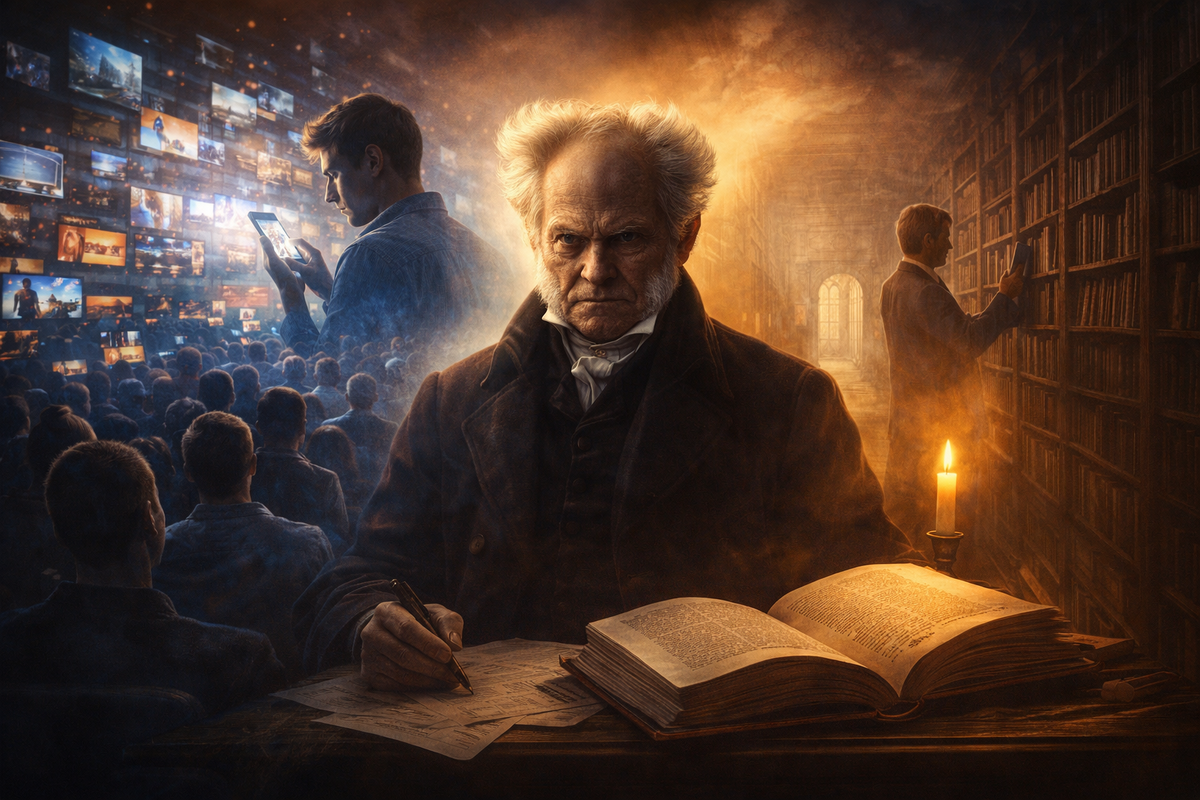Очень легко прочитать эту мысль как высокомерие: мол, философ презирает людей и считает толпу глупой. Но это слишком простой вывод. На самом деле речь о другом. Шопенгауэр пишет о том, что человек почти всегда склонен выбирать не лучшее, а ближайшее, не глубокое, а удобное, не великое, а свежее и шумное. В том же пассаже он противопоставляет модное чтение — памфлеты, новинки, тексты дня — книгам, которые выдержали проверку временем.