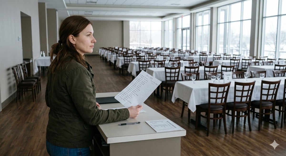 В зале было пусто — только вентиляция гудела под потолком, ровно и равнодушно, как холодильник в её однушке. Белые скатерти лежали на столах, готовые принять гостей, которые никогда не придут.