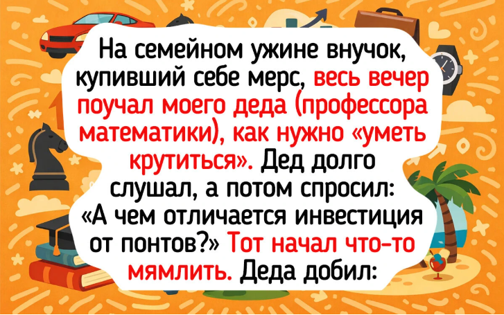 - На семейном ужине внучок, купивший себе мерс, весь вечер поучал моего деда (профессора математики), как нужно «уметь крутиться». Дед долго слушал, а потом спросил: «А чем отличается инвестиция от понтов?» Тот начал что-то мямлить. Деда добил: «Инвестиция — это когда ты молчишь, а деньги работают. Понты — это когда ты выпендриваешься, а кредит платит мама».