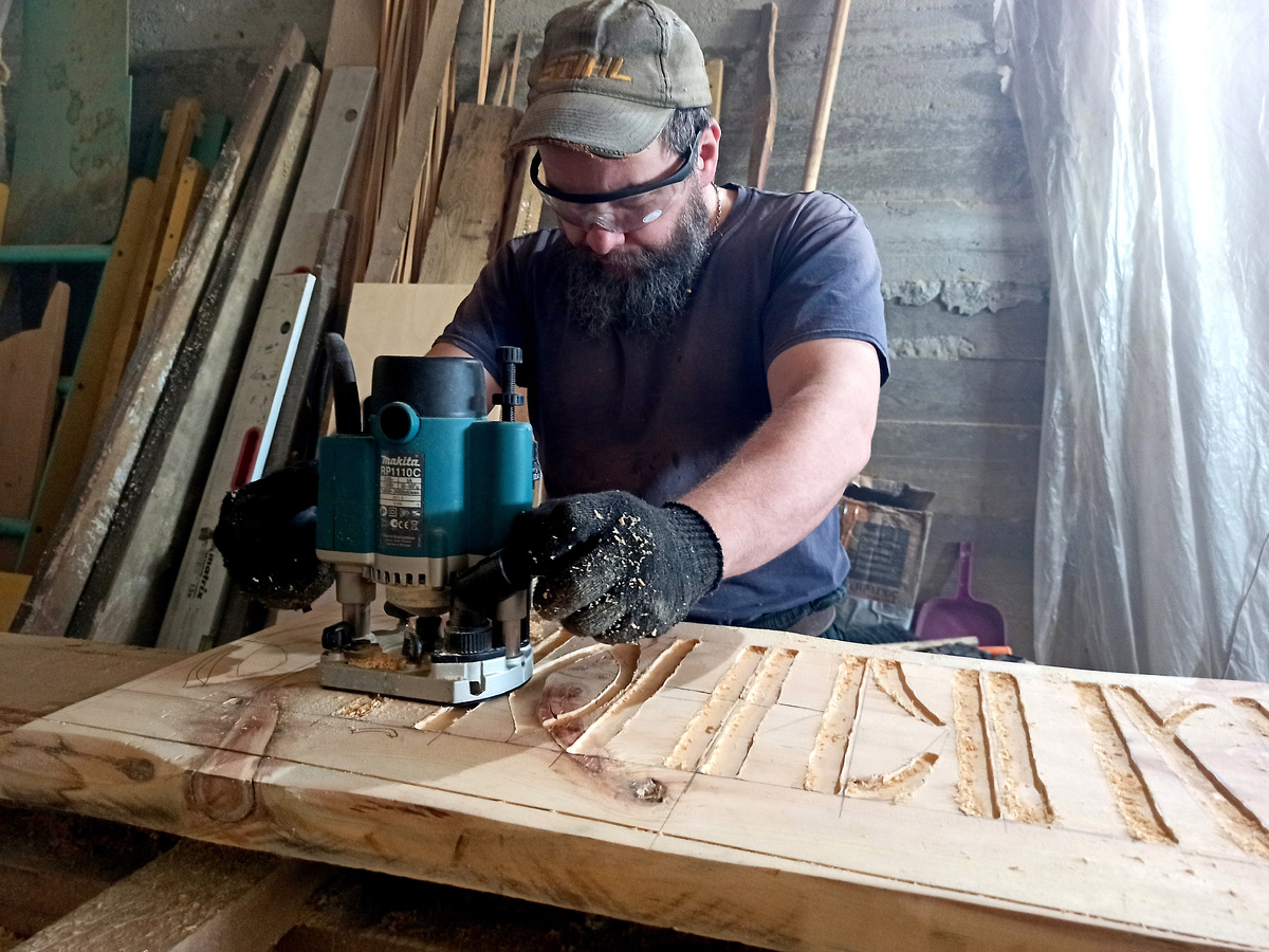 Когда мы с семьёй решили переехать из города в деревню, некоторые люди из моего окружения — родственники и знакомые — были очень рады этому решению и всячески поддерживали. Один добрый человек, да благословит его Господь, продал мне инструменты Makita за треть от стоимости. Пришёл к нему домой — в комнате стояли коробки с новым инструментом, и он сказал: «Выбирай». Сначала я выбрал самый необходимый, а — фрейзер, думаю: «Вдруг когда-нибудь пригодится». Спустя 11 лет жизни в деревне фрейзер вдруг стал моим «художником». Когда я решил сделать табличку с адресом дома (ул. Марии Лапкиной, 19) из дерева в славянском стиле, страх сменился азартом. Для начала на широкой доске карандашом набросал буквы, затем включил фрейзер с маленькой фрезой. На первый раз вырезал с углублением 1,5 см, на второй — уже 2,5–3 см. Каждый слой требовал терпения: сначала линии, потом объём, потом шлифовка. Даже мелкие ошибки превратились в узоры — как в старинных славянских надписях, где «неполные буквы» стали ча