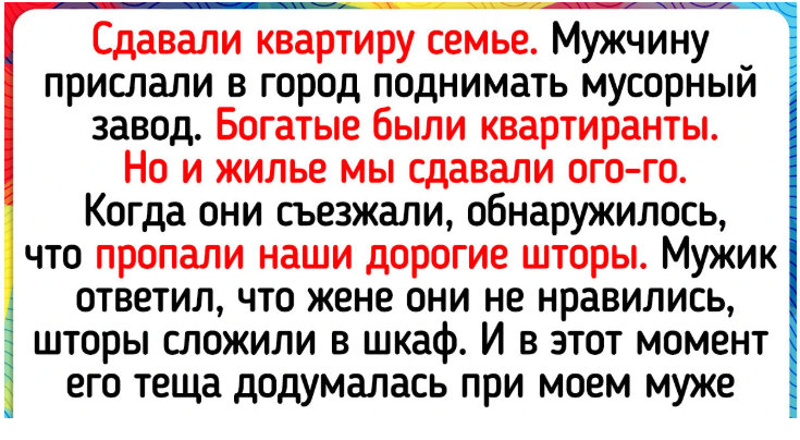 - Сдавали квартиру семье. Мужчина был прислан к нам в город поднимать мусорный завод. В общем, крутые и богатые квартиранты. Но и квартиру мы сдавали ого-го какую. Когда они съезжали, обнаружилось, что из спальни пропали дорогие шторы. Мужик ответил, что жене, которая уже уехала, они не нравились, они их сложили в шкаф. В этот момент его теща додумалась при моем муже разыграть гипертонический криз с вызовом скорой помощи, и мужу было как-то неудобно заниматься поиском занавесок, которые так и не нашлись. Позвонили им потом, культурно спросили, может, теща нечаянно сложила их со своими вещами. Обещали посмотреть и переслать, но больше на связь не вышли. Пришлось купить новые, но таких уже не нашли. До сих пор не поняли их поступок. © Светлана / ADME