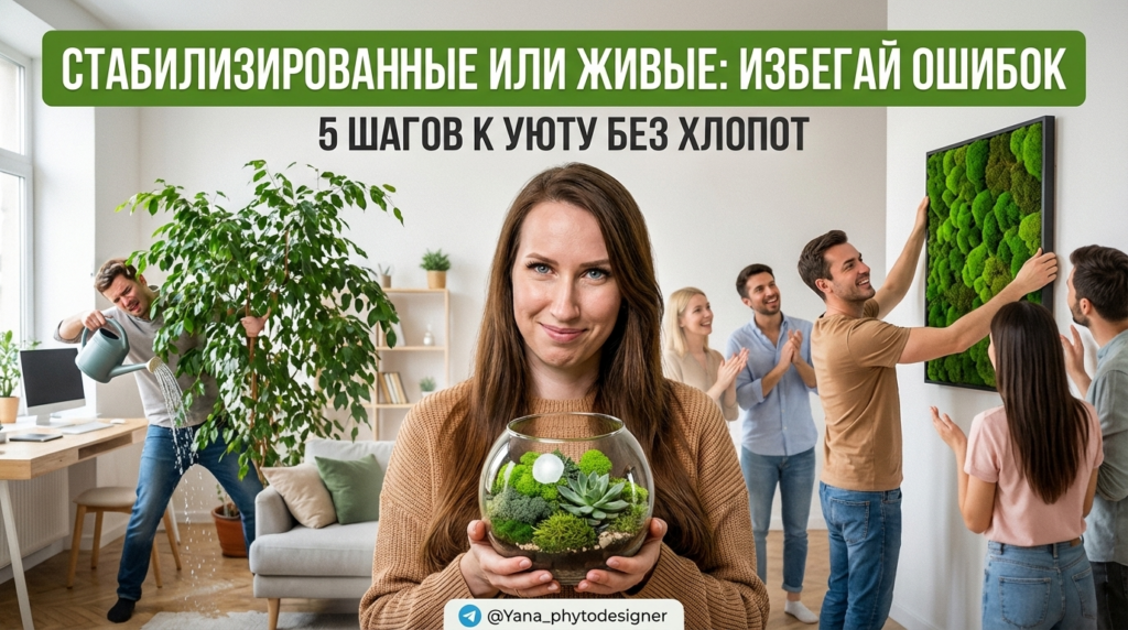 На встречах по проекту я вижу один и тот же момент: заказчик показывает референс с «зелёной стеной» или парой крупных деревьев и говорит, что хочется так же уютно — но без лишних хлопот; и вот тут в одной фразе смешиваются живые и стабилизированные растения, а иногда ещё и искусственные. Боль появляется позже: когда выбранный вариант вдруг начинает требовать больше внимания, чем планировалось, или выглядит «не так» уже через пару месяцев, и приходится переделывать. Если дочитаете, вы поймёте, как выбирать между живыми и стабилизированными растениями не по картинке, а по условиям, бюджету времени и задачам интерьера — чтобы зелень работала на атмосферу, а не на регулярные переделки.