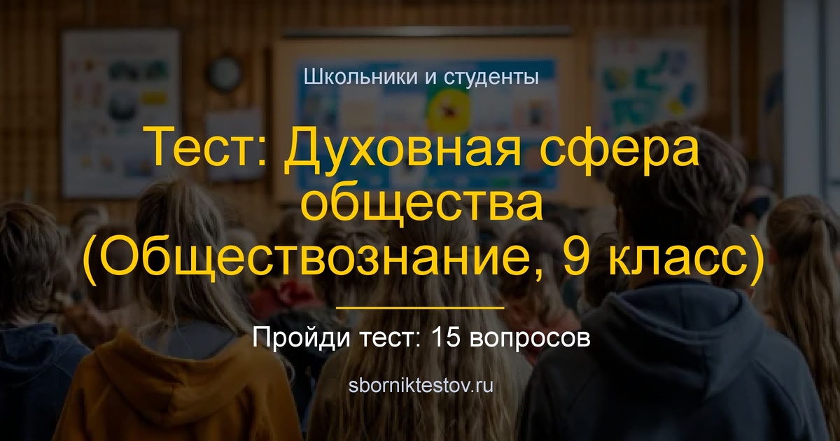 ) Проверь свои знания по духовной сфере общества в рамках программы 9 класса по обществознанию. Тест охватывает основные элементы духовной культуры: науку, образование, религию, мораль, искусство и их роль в жизни современного общества. Покажи, насколько хорошо ты усвоил материал о формах обществен... 15 вопросов · Тест на знания Уже прошли: 875 человек ▶️ Пройти в Телеграм ▶️ Пройти в MAX 🌐 Пройти на сайте СборникТестов