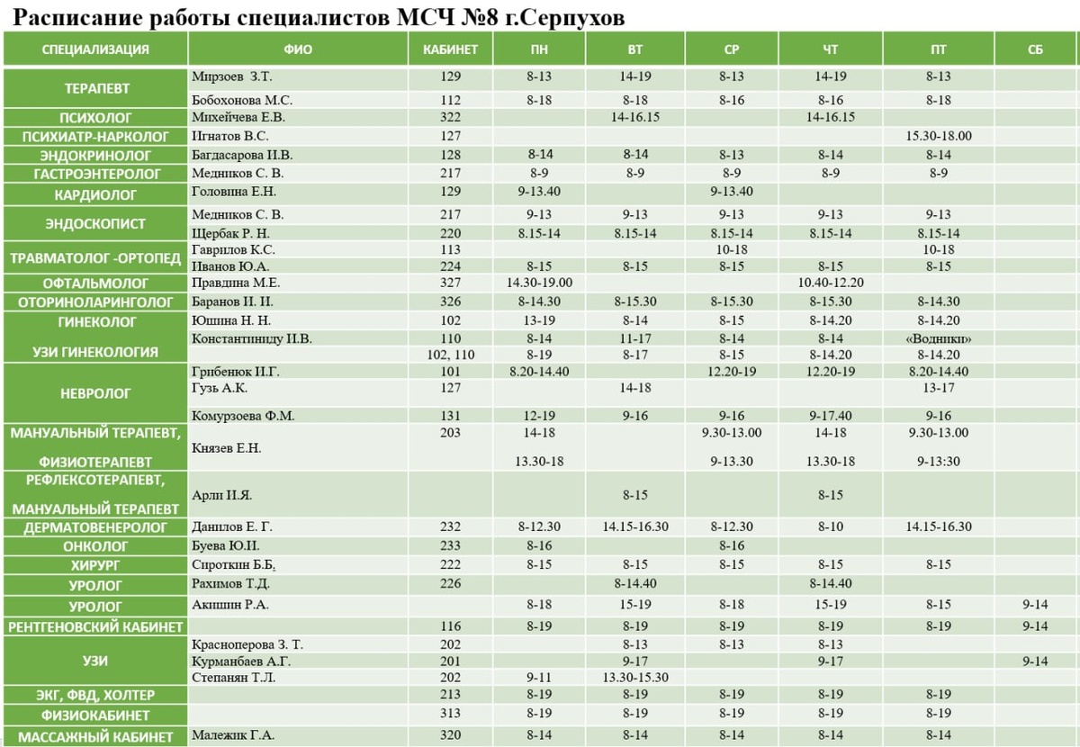 ГРАФИК РАБОТЫ СПЕЦИАЛИСТОВ МСЧ №8 на следующую неделю - с 30.03.26 по 04.04.26