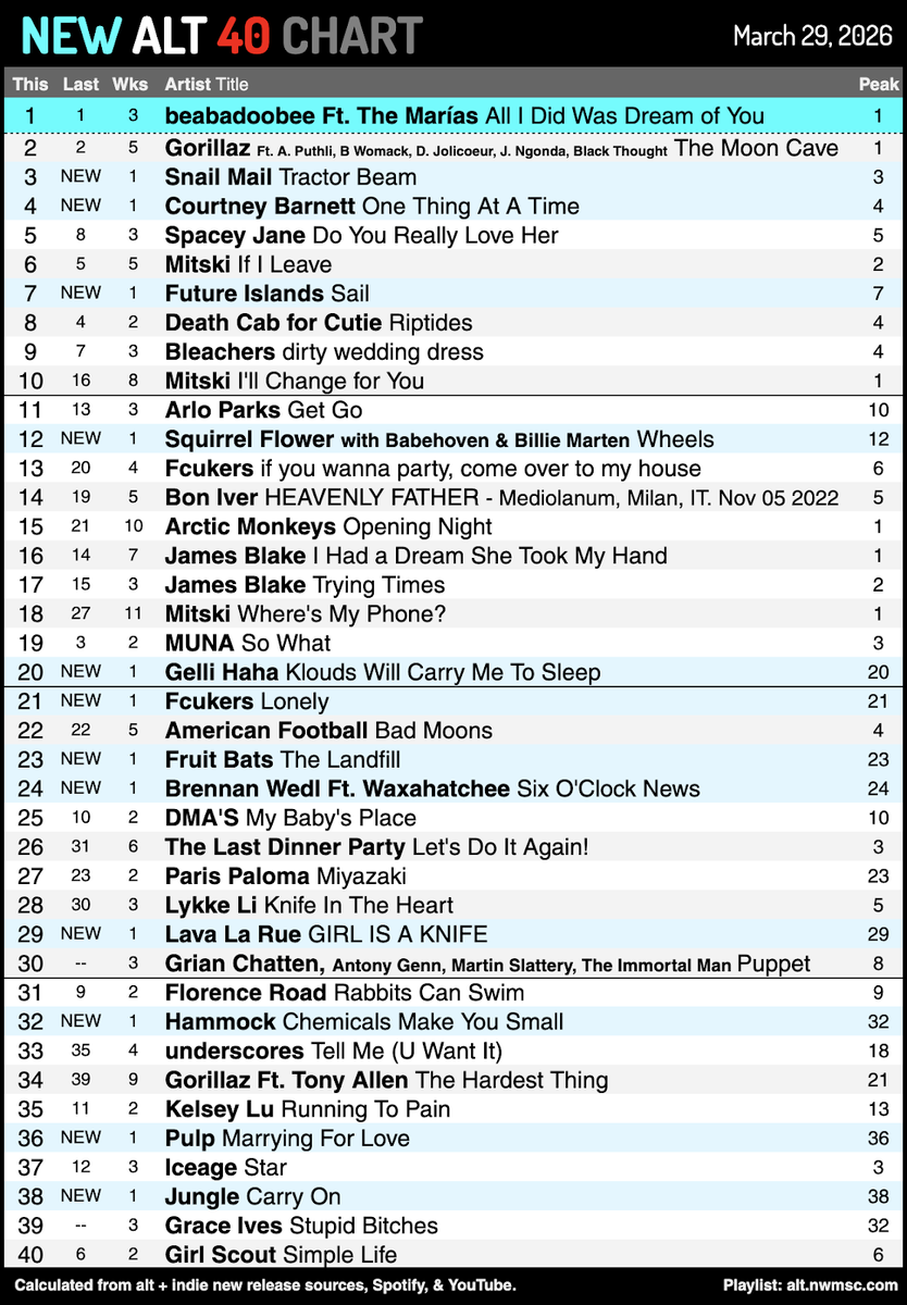 Методология: чарт составлен на основе десятков блогов и плейлистов, посвященных новым альтернативным и инди-релизам, а также просмотров на YouTube и Spotify. Источники оцениваются на основе исторических данных о новых альтернативных/инди-релизах (а не треках, не относящихся к данному жанру). Треки оцениваются на основе количества источников, репутации источников, голосов r/indieheads [FRESH] и среднесуточного количества прослушиваний на YouTube и Spotify.
