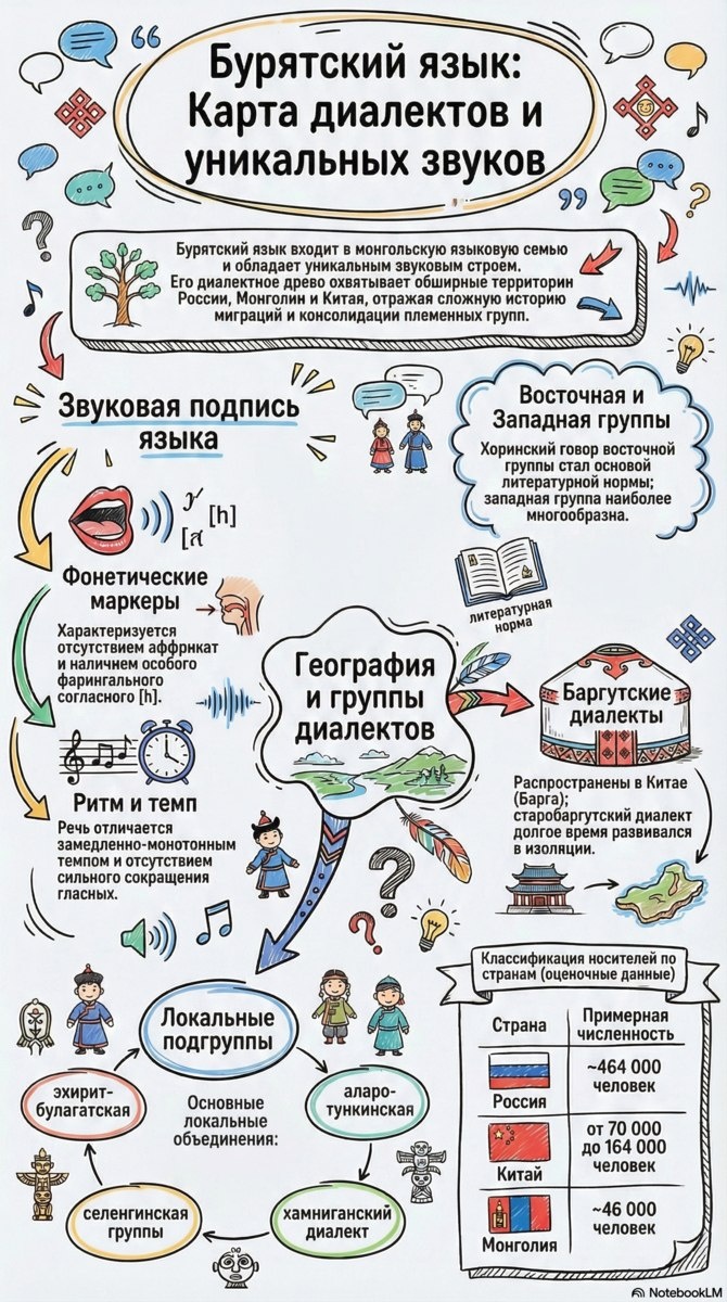 Бурятский язык входит в монгольскую языковую семью и обладает уникальным звуковым строем: в нём отсутствуют аффрикаты и присутствует особый фарингальный согласный [h]. Речь отличается замедленно-монотонным темпом и сохранностью гласных. Диалекты делятся на восточную и западную группы — хоринский говор лёг в основу литературной нормы. Баргутские диалекты, распространённые в Китае, долгое время развивались в изоляции. Локальные подгруппы включают эхирит-булагатскую, аларо-тункинскую, селенгинскую и хамниганский диалект. По оценочным данным, сегодня бурят 464 тысяч человек в России, до 164 тысяч в Китае и около 46 тысяч в Монголии. Наш канал в МАКС https://max.ru/join/YVAwC24Om0M3MRnk55k_5B_4PCWeQaA2KY-xjONdEnM