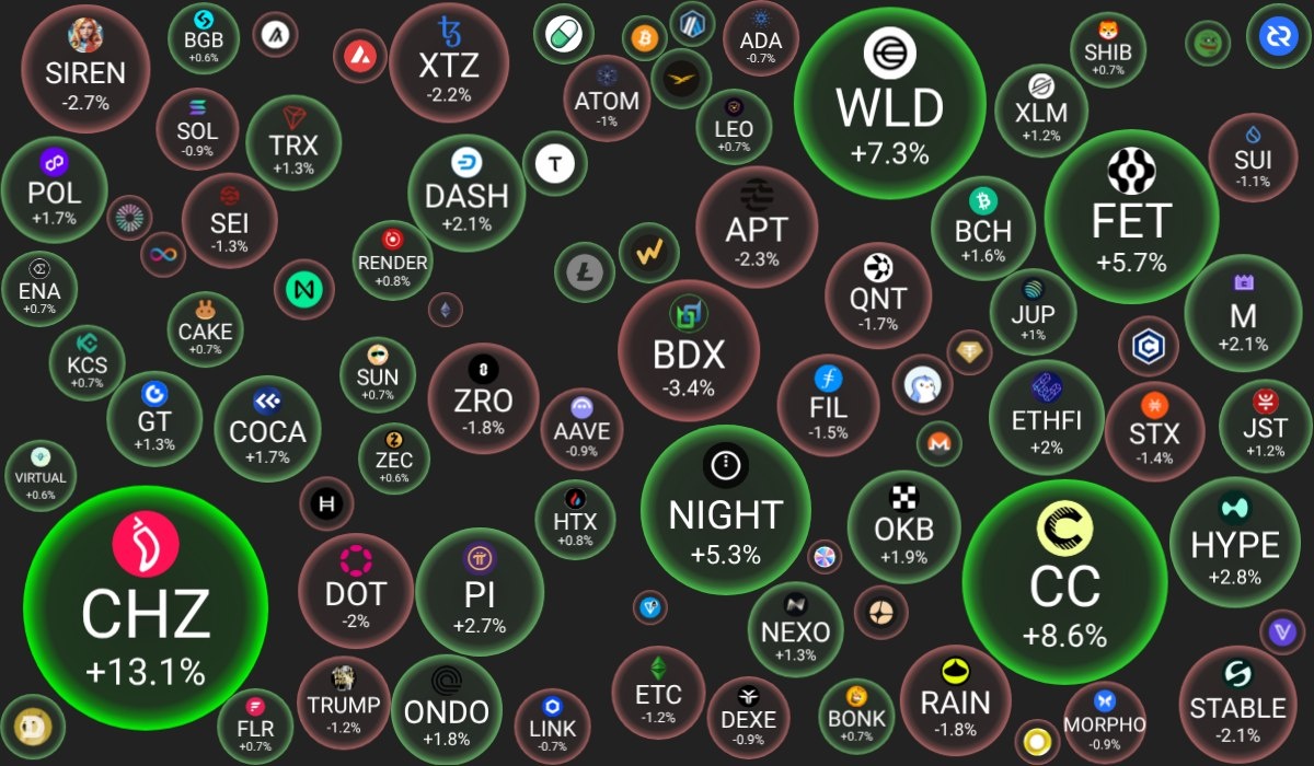 🗓 29.03.2026 09:30 по Москве. 🔗 Посмотреть на сайте 📈 Лидеры роста (из ТОП-100): 🟢 Chiliz (CHZ): $0.0409 (+13.1%) 🟢 Canton Network (CC): $0.1557 (+8.6%) 🟢 Worldcoin (WLD): $0.2732 (+7.3%) 📉 Лидеры падения (из ТОП-100): 🔴 Beldex (BDX): $0.0802 (-3.4%) 🔴 Siren (SIREN): $1.6067 (-2.7%) 🔴 Aptos (APT): $0.9299 (-2.3%) 🔍 Основные метрики: 🟢 Общая капитализация: $2300.70 млрд (+0.27%) 🔴 Общий объем торгов: $51.11 млрд (-46.99%) 🟢 Доминация Bitcoin: 57.92% (+0.01%) 🔴 Доминация Ethereum: 10.49% (-0.04%) 🔴 Индекс страха и жадности: 9 / 100: ЭКСТРЕМАЛЬНЫЙ СТРАХ (-3) 🟢 Индекс Альтсезона: 48 / 100: НЕ АЛЬТКОИН-СЕЗОН (+2) 📖 Интересно почитать: 👉 Hyperliquidity Provider (HLP) - зарабатывай на ошибках трейдеров 😻 Наши сервисы и бонусы: 💰 Cryptoage.com - рассказываем про Блокчейн и Криптовалюты с 2013 года 📈 Bitget - Скидка на торговую комиссию 20% + бонус до 200$