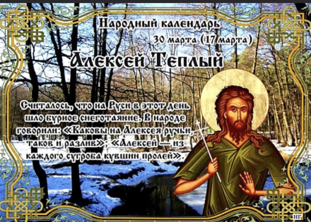 В понедельник 30 марта 2026 года судят о том, каким будет лето. В народном месяцеслове дата получила названия: Алексей теплый, Алексей – человек Божий, водотёк, пролей кувшин, с гор вода, с гор потоки.