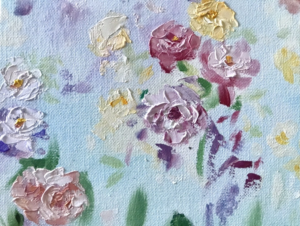 Чуть правее от центра у нас достаточно крупные бутоны цвета пыльной розы (синий+капля красного+белила) -одна, затем в замес я добавила еще каплю красного, получился более теплый оттенок - вторая роза, еще каплю красного - третья роза. Я выписывала бутоны сразу мастихином, вы можете поступить также, или можете сначала наметить их кистью - как вам будет удобней.
