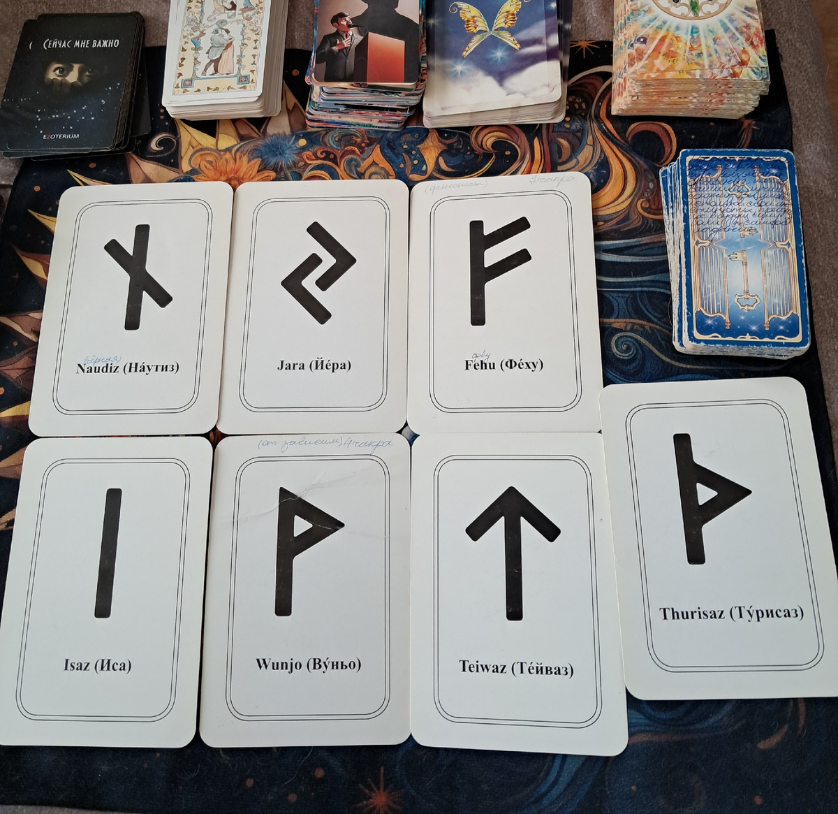 · Тейваз — уйдёт направленная борьба, жёсткая воля, противостояние. Вы перестанете тратить силы на то, чтобы «воевать» за место, за внимание, за справедливость там, где это уже не нужно. Уходит необходимость быть воином. Также Тейваз может означать уход мужской фигуры, которая была в роли «борца» или оппонента.