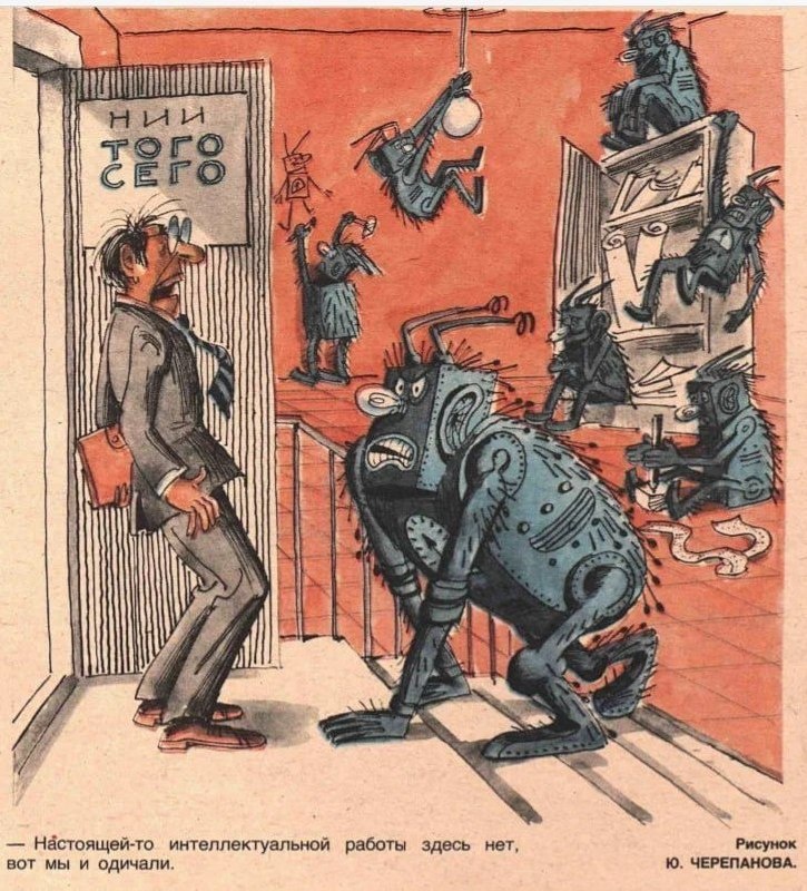 Это - пророческий рисунок замечательного художника Юрия Черепанова для советского журнала "Крокодил" 1973 года. "Настоящей интеллектуальной работы здесь нет. Вот мы и одичали." (с) Народ, кто идет со своими наследниками 16 апреля на нашу встречу в Дом Пионеров. Если вы семейно с ребятенком нарисуете картину на тему "Дикие Роботы" и пришлете ее Таис @taisusmanova до 11 апреля. То она там будет выставлена в холле. А после зрительского голосования кто-то получит замечательный приз всенародной любви. Наш веселый весенний детский оффлайн праздник здесь: https://gorizonty.mos.ru/events/30215 Напоминаю: Меры безопасности повышены. Только родители или бабушки/дедушки с детьми. И только по предварительной записи.