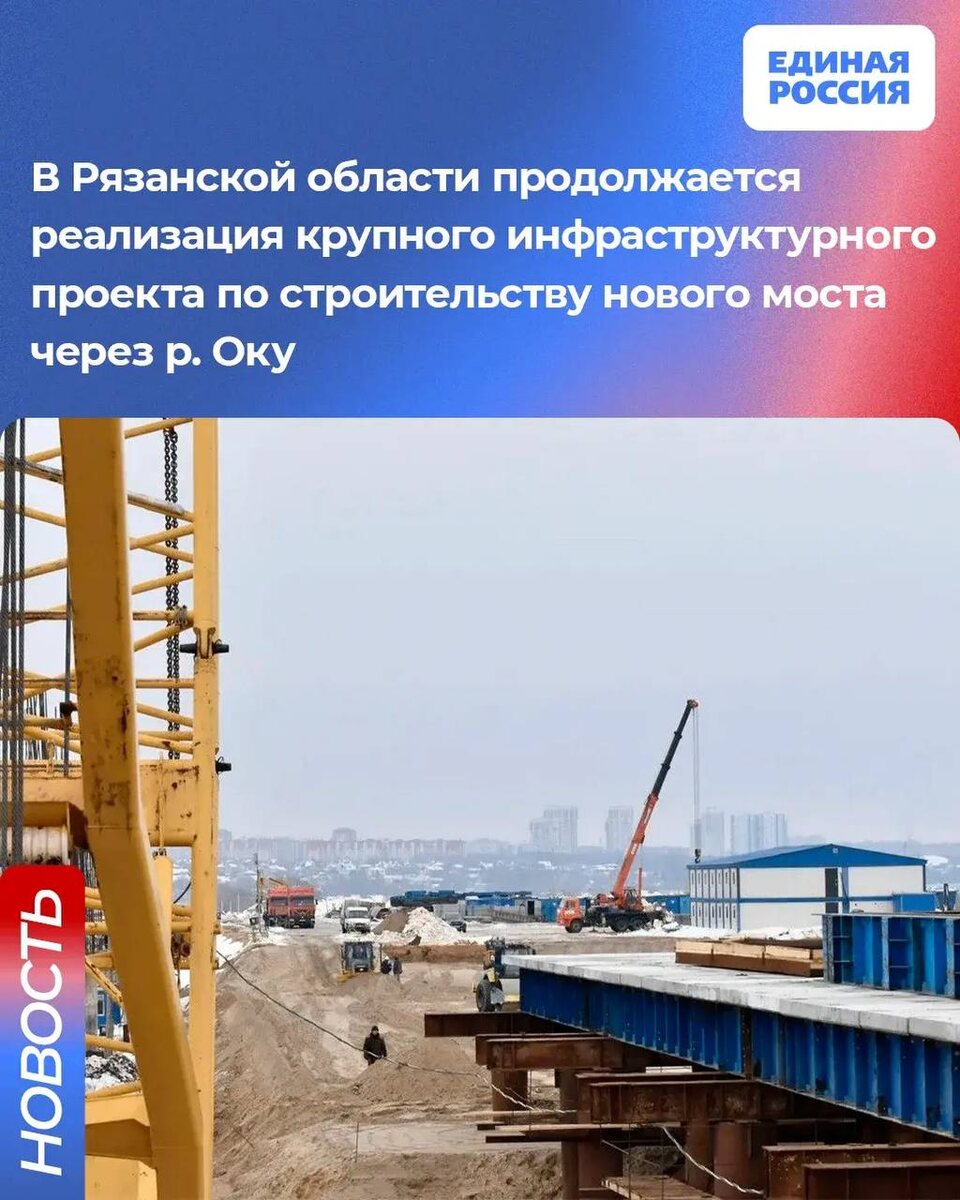 %. Работы в рамках партийного проекта «Безопасные дороги» и народной программы Единой России ведутся круглосуточно по обе стороны реки. Задействовано 108 единиц техники и 262 человека. Завершение работ планируется в 2029 году. «Новый мост через Оку – это один из ключевых инфраструктурных проектов для города и всей области, его строительство поддержал Президент РФ. Качество должно строго соответствовать всем строительным нормам и требованиям. Новый мост свяжет Рязань с пятью муниципальными округами и обеспечит удобный транзит в сторону Нижегородской и Владимирской областей», – подчеркнул секретарь реготделения Единой России, губернатор Павел Малков. #ЕдинаяРоссия #БезопасныеДороги62 #НароднаяПрограммаЕР 👻 МАХ | 💙 ВК | 📝 ДЗЕН