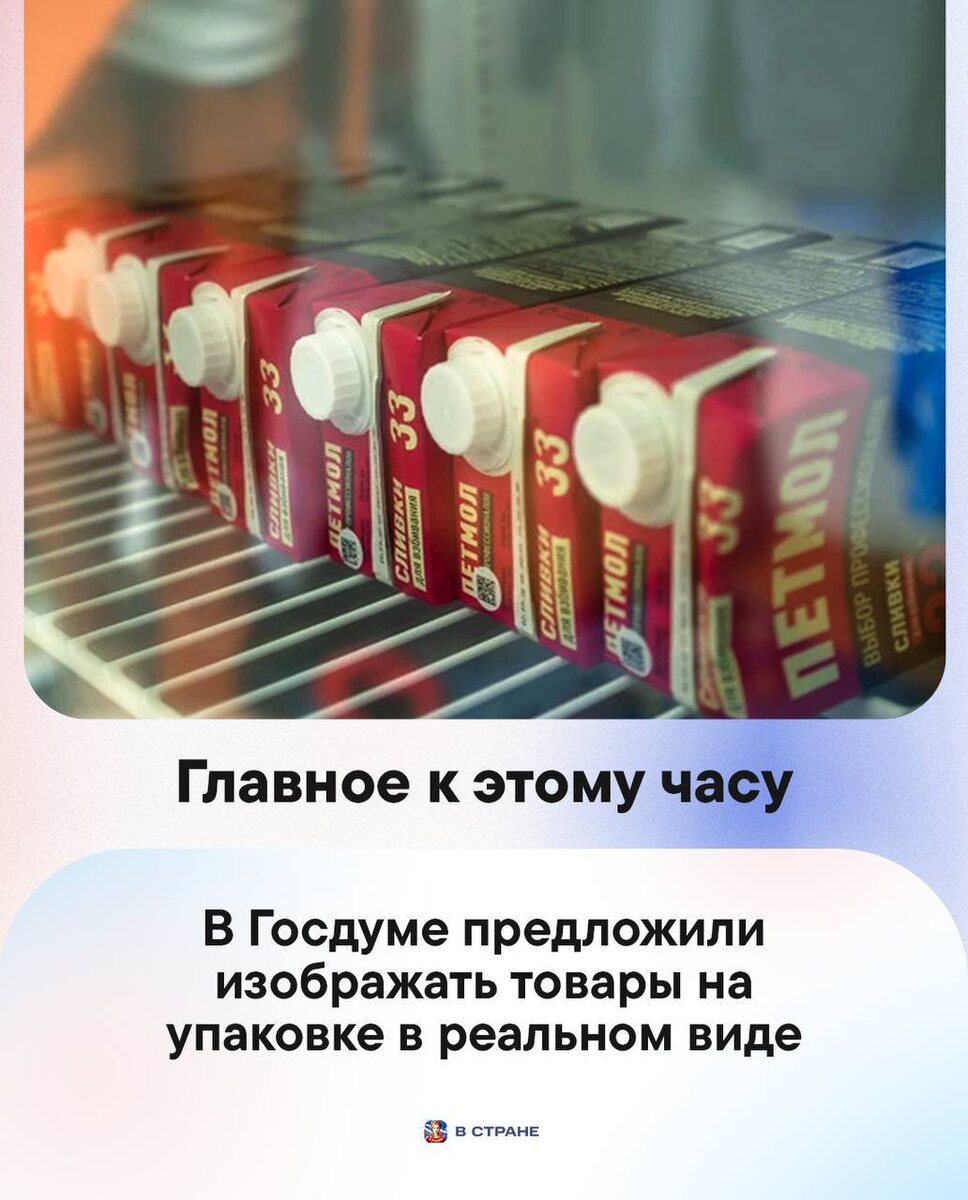: 🔹В Госдуме предложили изображать товары на упаковке в реальном виде. 🔹Россия в будущем готова принять и летние, и зимние Олимпийские игры, заявил Владимир Путин. 🔹Средства ПВО за ночь уничтожили над российскими регионами 203 украинских БПЛА, сообщило Минобороны. 🔹Механизм самозапретов в РФ стоит расширить на новые сферы, включая компьютерные игры, заявил депутат ГД Гусев. 🔹Академик РАН Онищенко призвал как можно скорее запретить вейпы в России. 🔹Миронов предложил расширить майские праздники за счет новогодних. ✅ «В Стране» в MAX