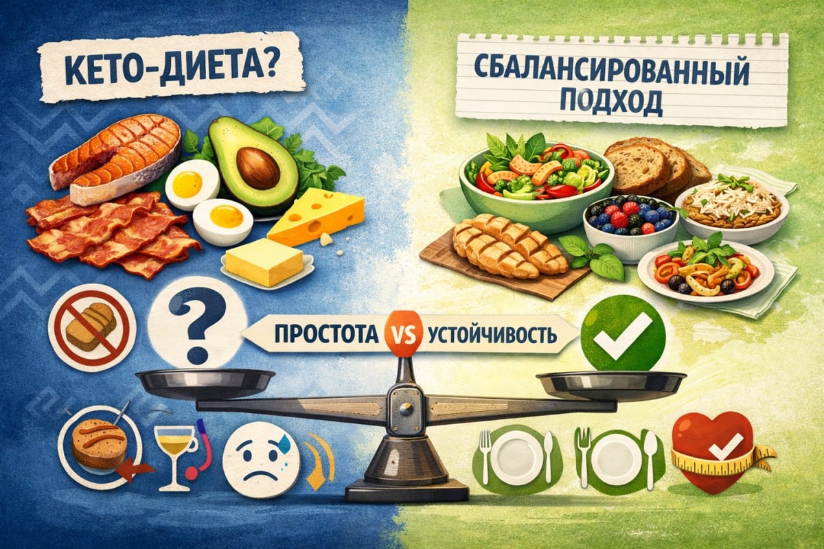 : "Все никак не спрошу. А вы против кето диеты? Или просто считаете, что ваш метод более щадящий? Я сейчас вспоминаю, все кого я знаю, кто страдает избытком веса, все отказываются именно от углеводов" Мой ответ: Я не «против» кето как таковой. Этот подход имеет право на существование и в некоторых случаях действительно может давать результат. Но важно понимать, за счёт чего этот результат происходит. Когда человек убирает углеводы, он автоматически упрощает питание: становится меньше перекусов, меньше сладкого, меньше «хаотичной» еды. Падает общая калорийность — и вес уходит. То есть дело не столько в «магии кето», сколько в том, что стало проще не переедать. При этом у кето есть нюансы: — сложно соблюдать в долгую — ограничивает привычный рацион и социальную жизнь — не всегда комфортно по самочувствию и тренировкам — часто приводит к откатам, когда человек возвращает углеводы ❗️ ведь есть в "обычном" ритме вы так и не научились Я в работе исхожу из другой логики: не убирать пр