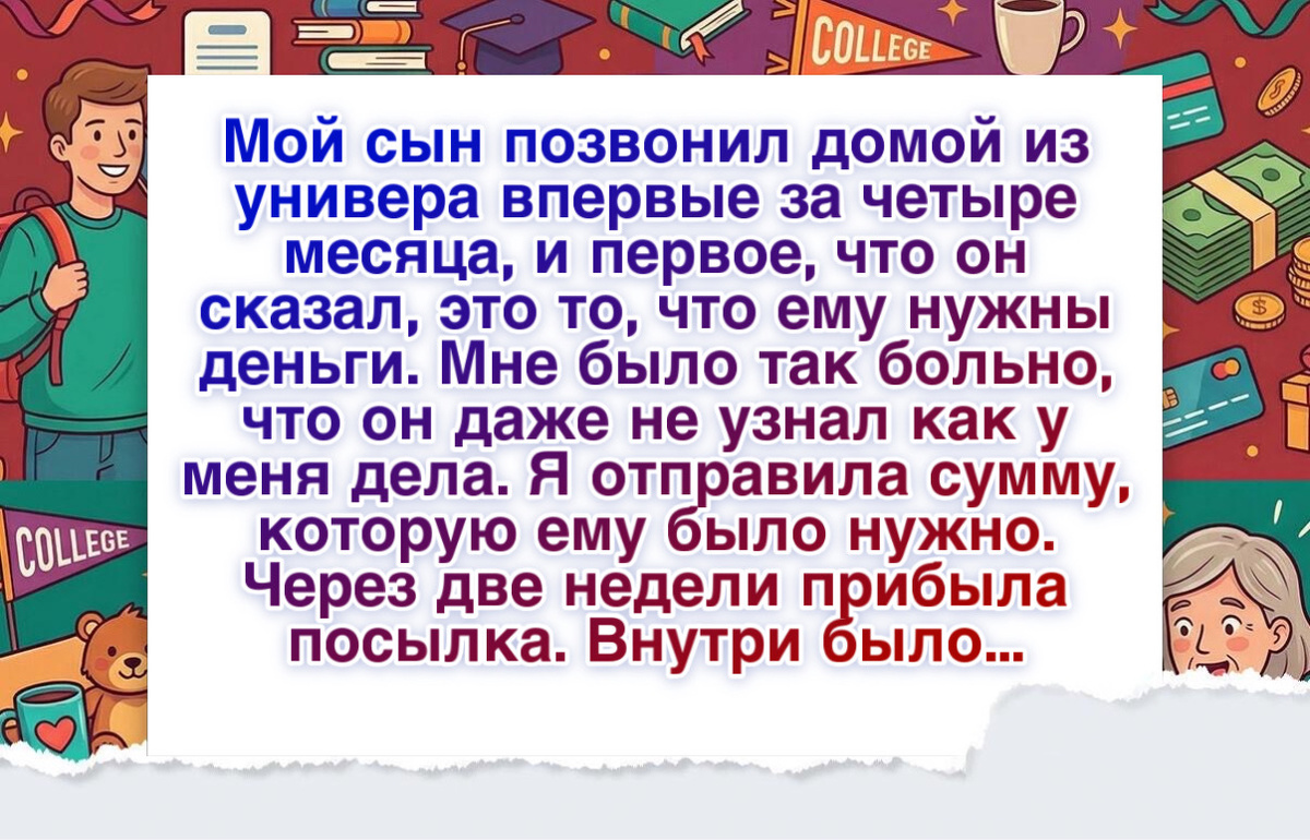 “Мой сын впервые позвонил домой из университета за четыре месяца, и первое, что он сказал, было то, что ему нужны деньги. Мне было так больно, что я едва не сказала то, о чем потом пожалела бы. Я просто перевела ему нужную сумму и ничего не сказала. Через две недели пришла посылка. Внутри была фотография в рамке, где ему шесть лет, он помогает мне красить задний забор, мы оба в белой краске и смеемся над чем-то, чего уже не помним. Он нашел эту фотографию, когда разбирал коробки в общежитии, распечатал и вставил в рамку, ничего мне не сказав. Я поставила ее на кухне, от плиты ее хорошо видно. В следующее воскресенье он снова позвонил. Уже не из-за денег. Просто поговорить.”