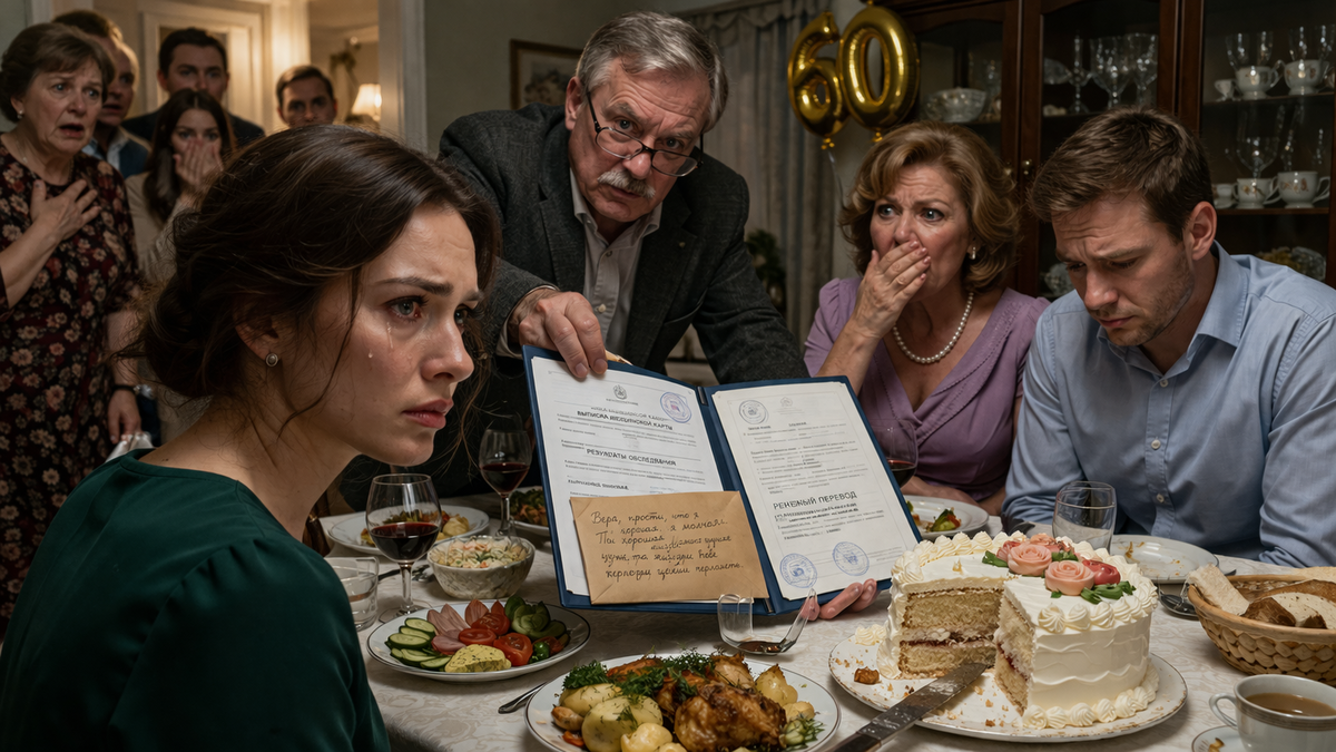 Юбилей отмечали у свёкров. В большой комнате было душно от разговоров, от духов, от работающего телевизора, который никто не слушал, но почему-то не выключал. За столом уже сидели родственники: сестра Тамары Леонидовны Нина с мужем, племянница Катя, двоюродный брат с женой, соседка по лестничной клетке, которую пригласили “на минутку”, а она осталась с самого начала. Во главе стола, у окна, в новом сиреневом платье сидела сама именинница. Справа от неё — Павел, муж Веры. Слева — Николай Андреевич, свёкор. Он сидел ровно, как всегда, ладони лежали по обе стороны от тарелки, и с самого начала вечера почти не говорил.