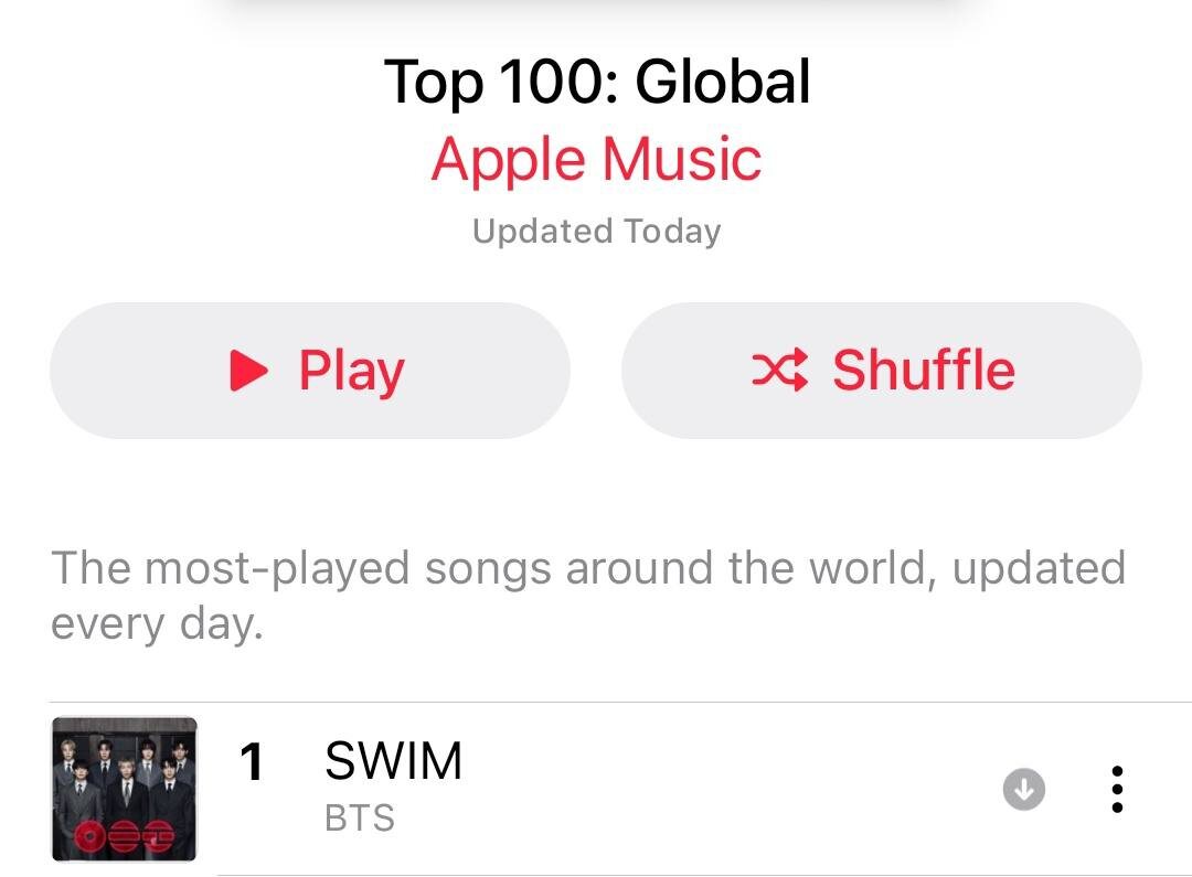 🌷 "Swim" седьмой день подряд удерживает первую строчку в глобальном чарте Apple Music.