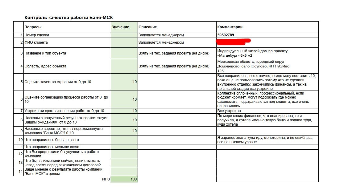 Если просто — это показатель того, насколько клиент доволен продуктом и компанией и готов ли он вас рекомендовать. --- После завершения каждого проекта наш отдел качества делает контрольный звонок через ~2 месяца и заполняет такую таблицу 👆 Это важно: не в момент сдачи, когда эмоции “на пике”, а когда человек уже пожил с баней и понял все нюансы. --- Иногда у нас бывает NPS = 100%. Не часто, но стабильно. Средний показатель по году: 86% (по всем построенным баням). --- И тут важный момент. В стройке в принципе сложно держать высокий NPS. Это стресс для клиента: деньги, сроки, ожидания, подрядчики, решения… Поэтому даже у компаний, которые вообще считают этот показатель, он редко превышает 60%. А большинство строительных компаний его не снимают вовсе. --- Мы снимаем. Потому что это единственный честный способ понять: где мы реально молодцы, а где нужно дорабатывать. --- Наша задача — максимально безболезненно провести клиента за руку через этот непростой процесс. И каж