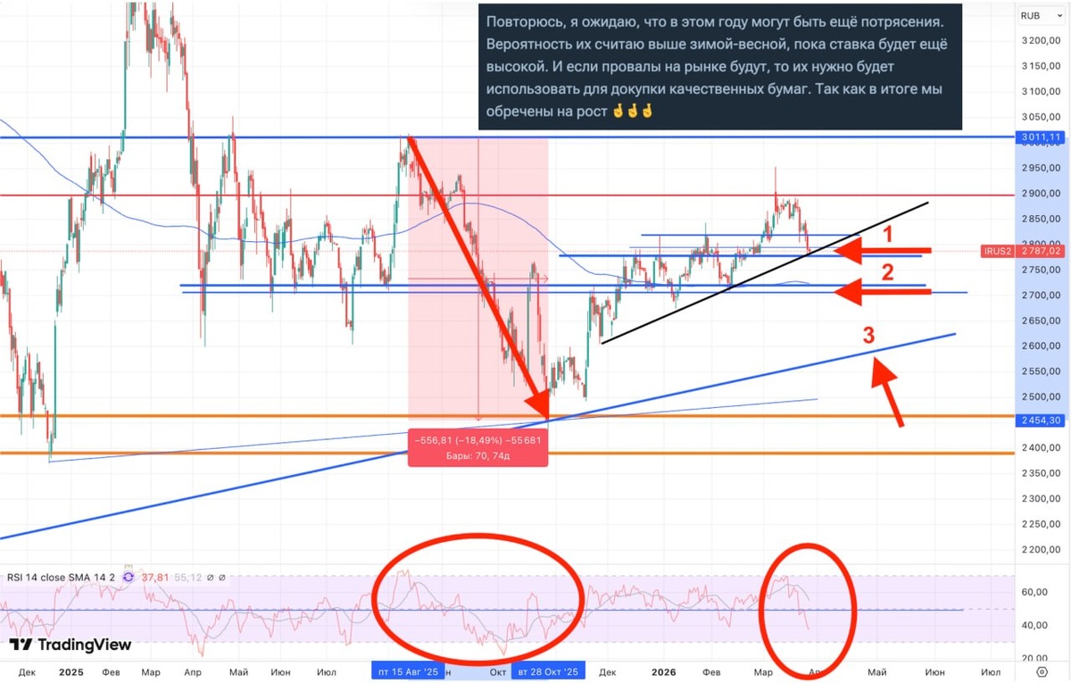 ☕️ Смотрю, как валится наш рынок против рыночной логики (возможно, мы узнаем её постфактум), и текущая ситуация очень напоминает мне происходящее в сентябре-октябре прошлого года. Смотрю на график и вспоминаю, тогда рынок непрерывно укатывали с середины августа до конца октября на 18%. Тот же $T тогда после отличного отчёта укатали с 3400 на 2840, а это почти -17% (см. графики). И настроения на рынке тогда были такие же депрессивные, и народ тоже возили на маржинколы. А потом всё развернулось и улетело вверх 🚀 В начале года писал в кофеине, что жду в этом году потрясения и провалы на рынке зимой-весной. По логике, которая пока реализуется, перед неизбежным ростом рынка на снижении ставки, бумаги должны перейти из слабых рук в руки тех, кто понимает фундаментальную ценность компаний и пользуется возможностью. Как говорится, на Олимп толпой не ходят, и перед ростом часто происходит разочарование в рынке 🤷🏻♂️ Докуда может падать рынок? 🤔 Учитывая непонимание мной объективных п