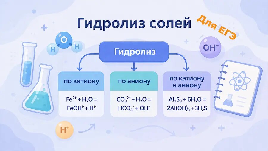 Гидролиз солей — тема, в которой многие ошибаются из-за путаницы в типах солей и среде раствора. В статье простым языком разобрано, что такое гидролиз, как определить, идет ли он по катиону, по аниону или по обоим ионам, и как не теряться в задании №21 на ЕГЭ. Материал подойдет тем, кто хочет не просто заучить отдельные случаи, а понять логику темы и уверенно решать экзаменационные задания с гидролизом. https://egehim.ru/academy/obschaya-himiya/hydroliz-solei-na-ege-po-himii