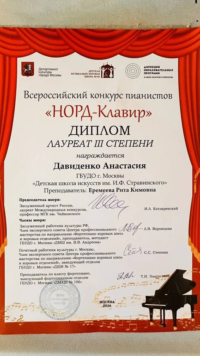 ! ✨ 🏫 6 «Д» класс, 2 здание 🎹 Давиденко Настя приняла участие во Всероссийском конкурсе пианистов «Норд-клавир» и стала Лауреатом III степени. 👏 💃 Дорошевич Александра достойно выступила: — на окружном конкурсе-смотре по хореографии (СЗАО) — Гран-при 🏆 — 14 марта с коллективом «Флокс» на международном фестивале-конкурсе «Петрушка» — коллектив стал Лауреатом I и II степени 🎉 🤸♀️ Абрамова Мария 28 февраля приняла участие в Открытом турнире Snow Queen по художественной гимнастике среди гимнасток 2014 года рождения и заняла: 🥈 2 место в общем зачёте 🥉 3 место в упражнении с обручем 👏 Поздравляем наших талантливых учениц с яркими достижениями! Желаем новых побед, вдохновения и уверенности в своих силах! 💫 #школа1538