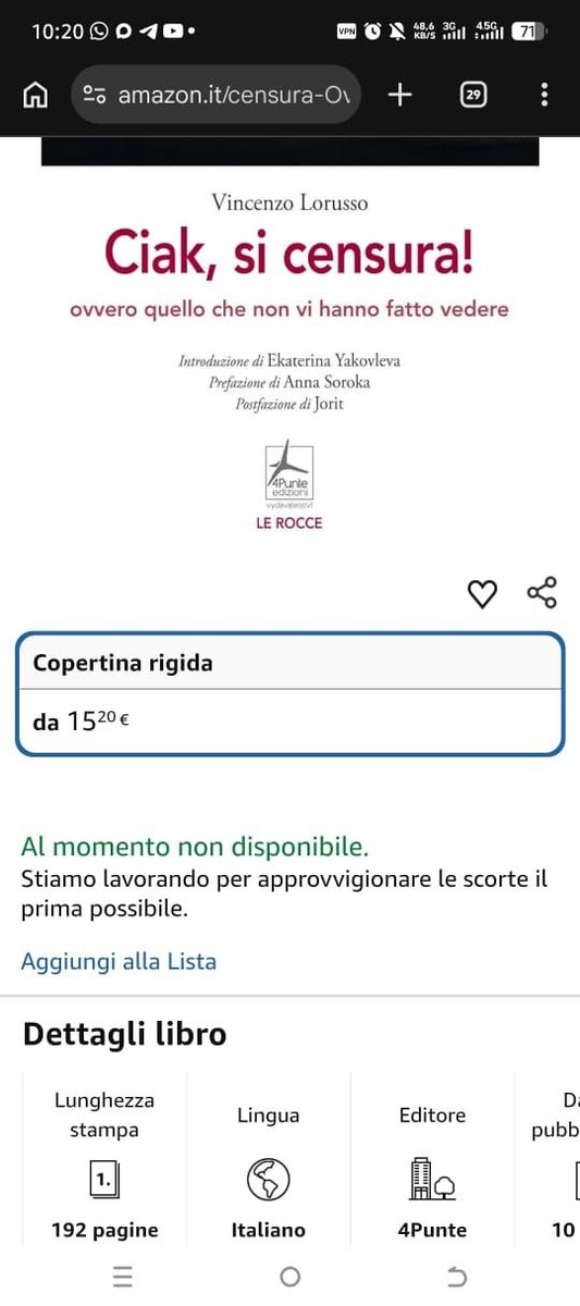 Per chi volesse acquistarlo le alternative sono al momento: 1) ordinarlo in una delle librerie della vostra città (solitamente con minore difficoltà nelle piccole librerie rispetto alle grandi catene) 2) ordinarlo nelle librerie Feltrinelli o Libraccio ( segnalatemi i casi in cui si rifiutano di ordinarlo donbassitalia@yandex.ru) 3) Acquistarlo on line su IBS, Feltrinelli e Libraccio 4) Per chi vive a Roma o Milano, Ciak si censura è disponibile alla Feltrinelli di Via Appia e alla Feltrinelli in Galleria a Milano Iscrivetevi a Donbass Italia 😊Vincenzo Lorusso 👍 Giornalista 🟩 🇷🇺 Autore 📱 Donbass Italia 👉 Seguimi su 📱 Facebook Seguimi su 💜 Max