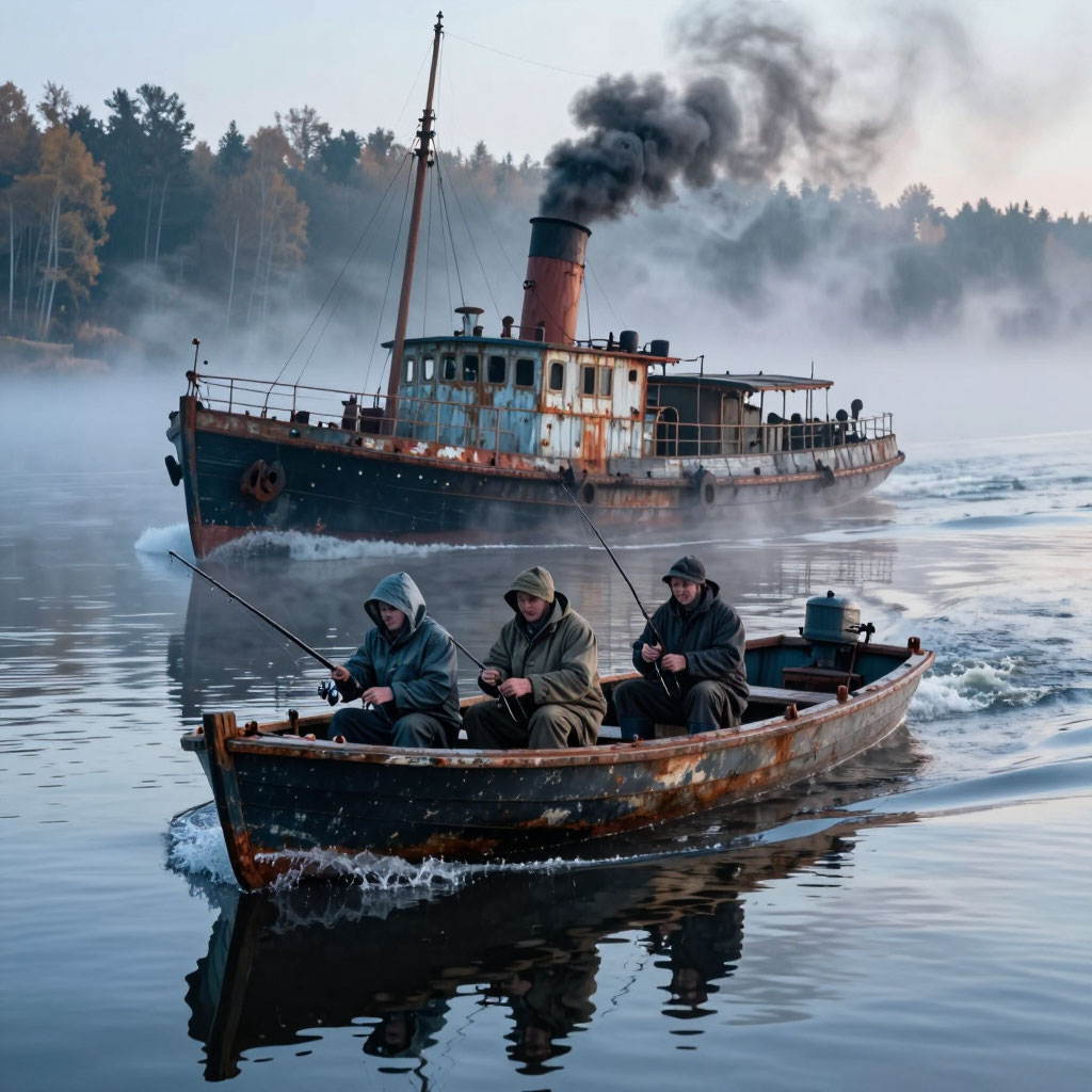 На реке Каме, где вода течёт медленно, словно застывшая память веков, а утренний туман порой сгущается так плотно, что скрывает даже ближайшие деревья, с давних пор ходят шёпоты о судне, которого не должно существовать. В конце октября 2017 года трое рыбаков — отец Иван и его сыновья Сергей и Дима — стояли на своём катере у острова Ключевой, ожидая утреннего клёва. Время близилось к пяти утра: небо ещё дремало, лишь на востоке брезжила слабая заря. Внезапно наступила абсолютная тишина — ни плеска волн, ни крика птиц, ни даже лёгкого гула далёкого города. Казалось, сама природа затаила дыхание. И тогда из молочной пелены возник он. Старый пароход, напоминающий модели типа «Комсомолец» или «Пионер», давно вышедшие из строя. Потемневший от времени деревянный корпус, ржавые поручни, облупившаяся краска. На корме виднелась надпись: «Амур». Буквы были неровными, но разборчивыми. Из трубы валил густой чёрный дым — однако он не зависал в воздухе, как положено, а растворялся, будто его никогда