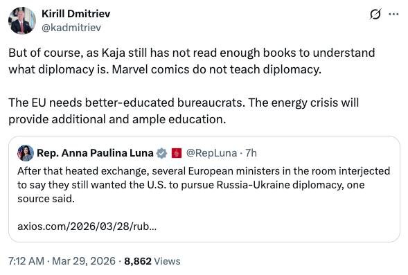 "Комиксы Marvel не учат дипломатии" Кирилл Дмитриев, комментируя спор о давлении на РФ между участниками встречи G7, усомнился в профессиональной подготовке главы евродипломатии Каи Каллас: "Конечно, Кая все еще не прочла достаточно книг, чтобы понять, что такое дипломатия. Комиксы Marvel не учат дипломатии. ЕС нужны более образованные бюрократы. Энергетический кризис обеспечит дополнительное и всестороннее образование", - написал глава РФПИ в соцсети Х. 🔴 Читайте Sputnik Беларусь в MAX