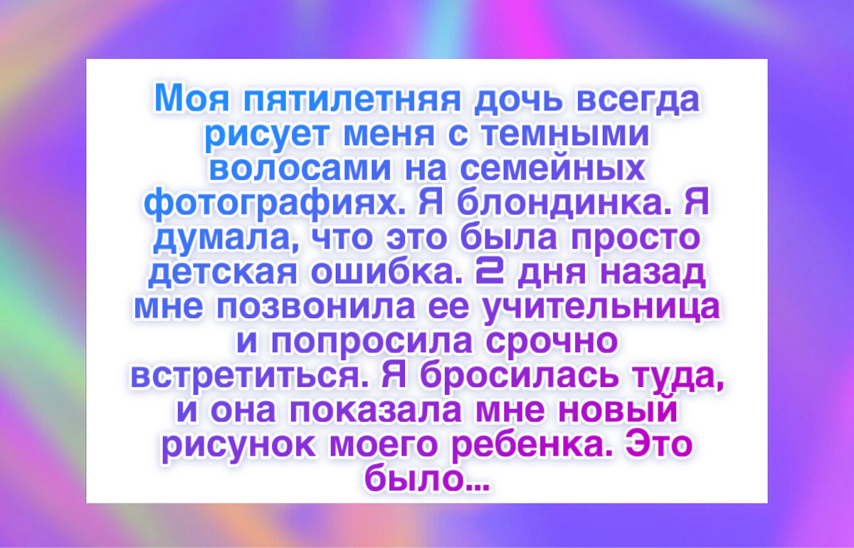 “Моя пятилетняя дочь всегда рисовала меня на семейных рисунках с коричневыми волосами, хотя я блондинка. Я думала, что она просто ошибается. Но недавно учительница позвонила и попросила срочно прийти. Она показала новый рисунок моей дочери, и у меня внутри все похолодело. На рисунке я лежала с закрытыми глазами, а рядом стояла женщина с темными волосами и держала мою дочь за руку. Учительница аккуратно спросила, не видела ли она дома чего то пугающего. Вечером я спросила дочь, что это за рисунок. Она улыбнулась и сказала, помнишь, когда ты упал на кухне, пришла тетя и держала меня за руку, чтобы мне не было страшно. Три недели назад я потеряла сознание из за низкого давления, и наша соседка Мария прибежала и сидела с моей дочерью, пока я не пришла в себя. Моя дочь просто пыталась пережить тот страшный момент через рисунки.”
