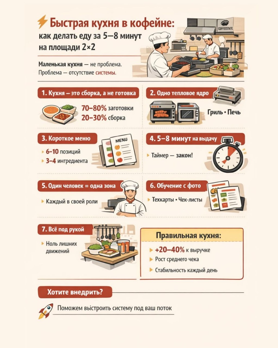 Большинство кофеен теряют деньги на еде не потому, что нет гостей. А потому что кухня не выдерживает поток. Очередь растёт → гость уходит → средний чек падает. И это происходит каждый день. Маленькая кухня — не проблема. Проблема — отсутствие системы. Разберём, как сделать кухню, которая: 👉 ускоряет выдачу 👉 увеличивает чек 👉 не ломает команду 🔧 1. Кухня — это сборка, а не готовка Главная ошибка — играть в ресторан. В кофейне работает другая модель: 👉 70–80% — заготовки 👉 20–30% — сборка Что это значит на практике: • курица / мясо — уже готовы • соусы — готовы • овощи — нарезаны • хлеб — подготовлен На точке ты не готовишь. Ты собираешь продукт как конструктор. 🔥 2. Одно тепловое ядро Ошибка: «поставим всё понемногу» Правильно — тепловое ядро: 👉 контактный гриль 👉 жарочная поверхность 👉 конвекционная компактная печь 👉 индукционная плита Почему это работает: • закрывает 80% меню • быстрый старт • минимум места • минимум ошибок ❌ Плиты и сложная кухня = тормоз пот