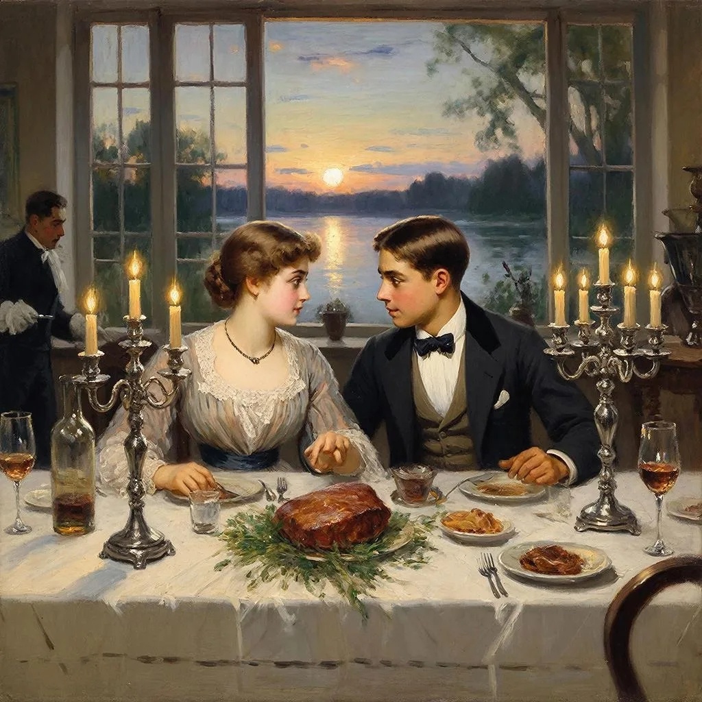 Столовая в имении Раевских была просторной и светлой. Огромное окно выходило в сад, где уже сгущались летние сумерки. Свечи в серебряных канделябрах отбрасывали на белоснежную скатерть тёплые, танцующие блики. Воздух был наполнен ароматом жареного мяса, свежей зелени и тонких французских вин.