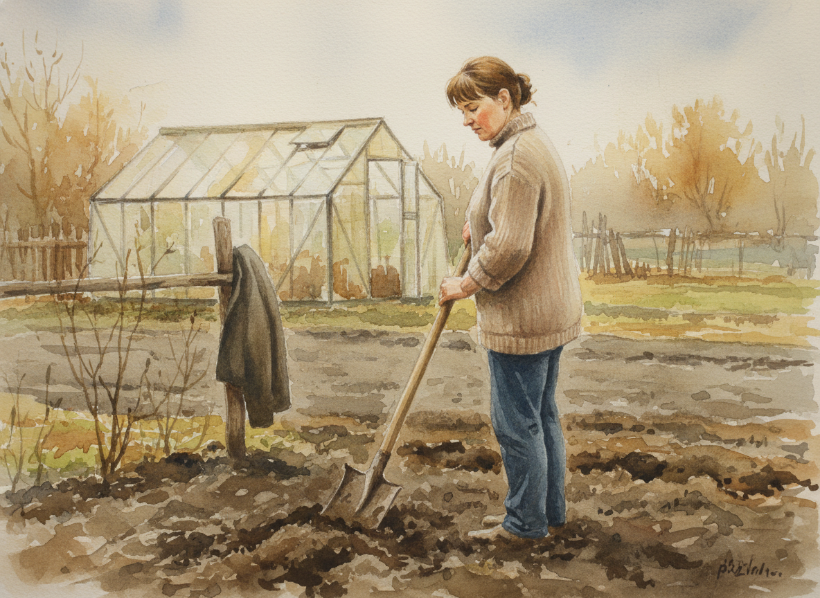 Я не ехала туда ни за каким «местом силы». Ехала потому что надо было. Муж сказал, что теплица накренилась и если не поставить подпорки до мая — всё, конец огурцам. Огурцы меня волновали мало, но я взяла выходной, собрала сумку и поехала. Три часа в электричке, потом двадцать минут пешком с пакетами. Пришла, открыла дом — там пахло старым деревом и мышами. Я вздохнула, поставила чайник и пошла смотреть на эту несчастную теплицу. Теплица стояла нормально. Муж, видимо, что-то перепутал. Или просто хотел чтобы я уехала на выходные — у него была какая-то встреча с друзьями, которую он стеснялся озвучить напрямую. Я не стала разбираться. Просто взяла лопату, которая стояла у забора, и пошла к грядкам. Зачем? Не знаю. Наверное, просто надо было что-то делать руками. Земля была ещё тяжёлая, апрельская. Я начала её перекапывать — без цели, без плана. Просто копала. Через десять минут у меня заныла спина. Через двадцать я сняла куртку. Через полчаса я поняла, что не думаю ни о чём. Вообще ни о