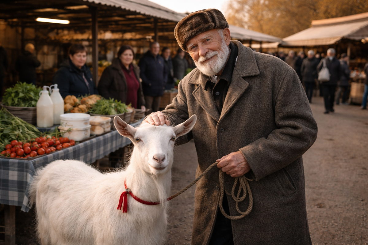 Не “мужчина с хозяйством”, не “фермер”, не “животновод”, а именно дед с козой — так его уже окрестили все окрестные языки, которые у нас, как известно, работают бодрее любого радио. Дед был худой, прямой, в старом сером пальто, застёгнутом не на ту пуговицу, и в шапке, которая видела, кажется, ещё дефицит сахара, купоны, перестройку и все людские разочарования по дороге. А рядом стояла белая коза. Небольшая, аккуратная, с умными жёлтыми глазами и красной ленточкой на шее, будто её не на рынок привели, а на какой-то нелепый сельский бал.