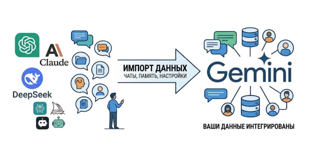 Google добавила в Gemini импорт данных из других ИИ-сервисов — можно перенести и память о себе, и архив переписок из ChatGPT и других чат-ботов. Как перенести память: 1. Зайти в настройки Gemini 2. Скопировать готовый промпт и отправить своему чат-боту 3. Скопировать ответ со сводкой о предпочтениях и переслать Gemini Как перенести историю чатов — скачать архив переписок, загрузить zip-файл в Gemini, диалоги появятся в интерфейсе. По данным Bloomberg, цель — переманить пользователей у ChatGPT и Claude. 🔗 Источник