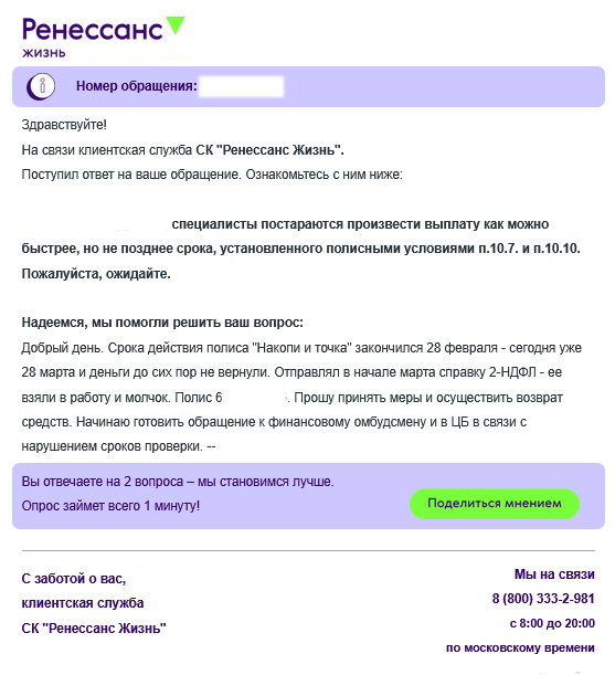 Всем привет! Уже писал, что случайно закрыл один из двух полисов (на самом деле удачно, так как по второму будет два месяца с повышенной ставкой) и страховая запросила документы, подтверждающие происхождение средств: О аналогичной ситуации пишут многие пользователи, кто решил получить 19% по "Накопи и точка". Пока делаю вывод, что задержка происходит именно при попытке закрыть полис, получив всю выплату. Так просто получение выплаты (на сопоставимую сумму) с пролонгацией полиса у меня ничего не запросили и выплатили в течение нескольких дней: специалисты постараются произвести выплату как можно быстрее, но