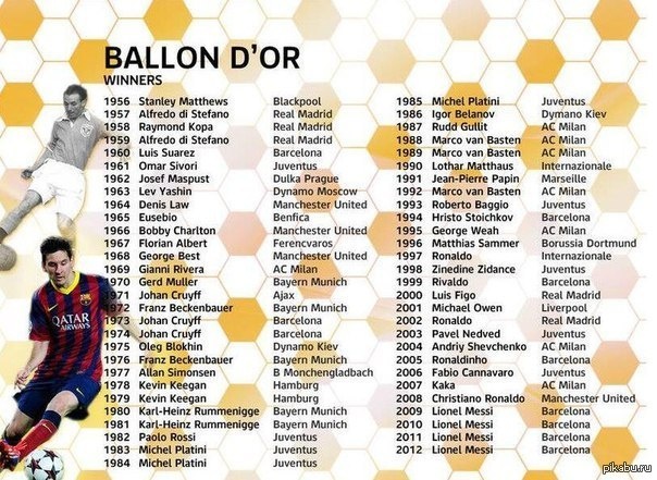 📜 Вот полный список обладателей «Золотого мяча» по годам: