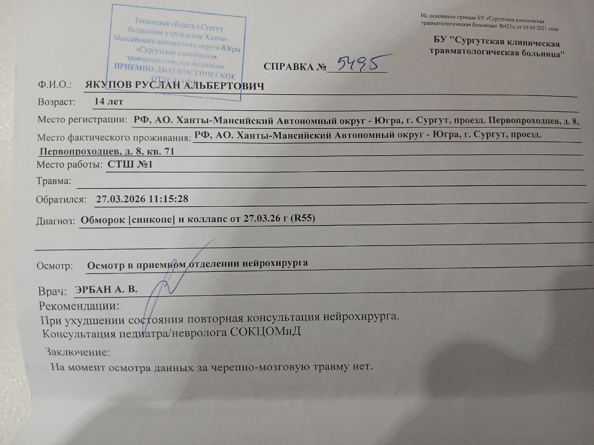 Поскольку в травматологии исключает только ЧМТ и по поводу обморока не обследуют, нам выдали направление в педиатрию с предложением вызвать скорую или доехать самостоятельно. У меня был в принципе здоровый, счастливый мальчик, который больше переживал, что ему придется идти сегодня в школу, чем по поводу здоровья и мы решили доехать на такси.