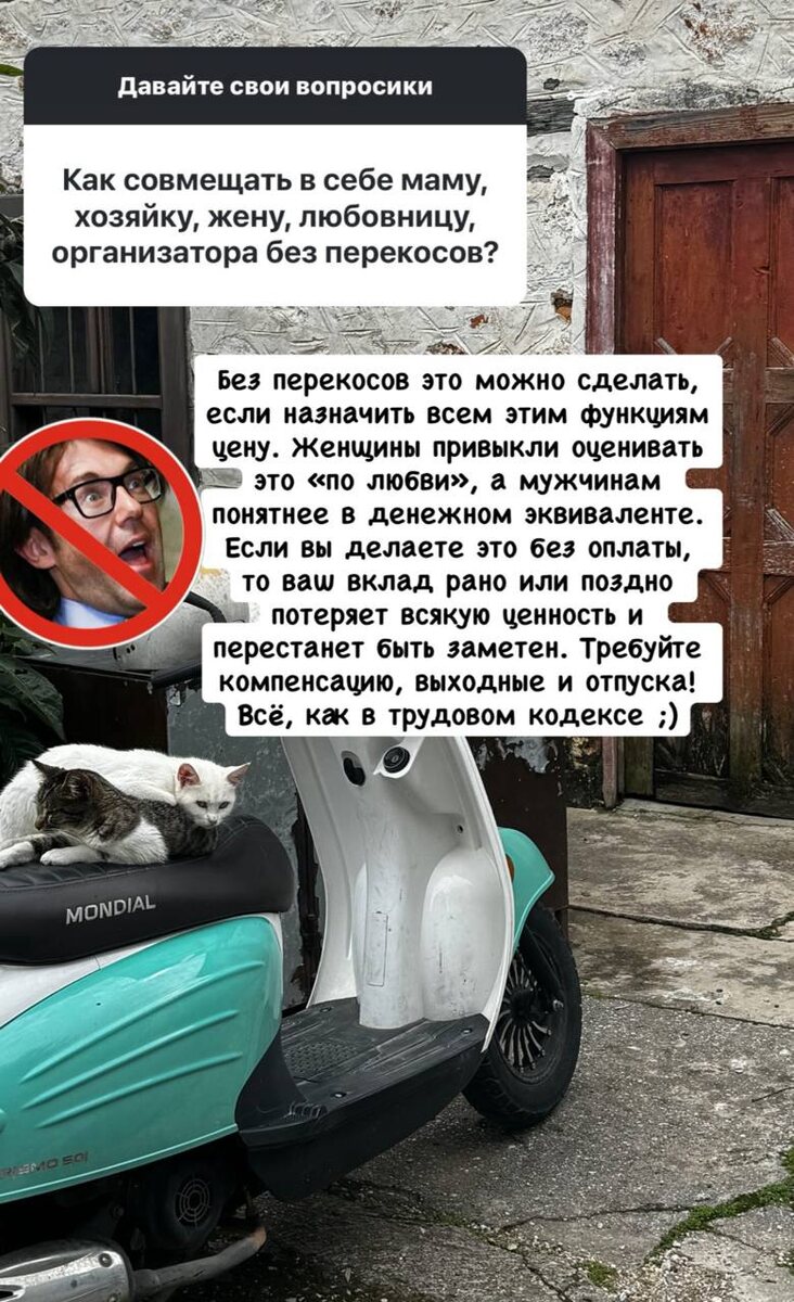 Всю работу по дому и воспитанию детей Анна Осокина предлагает сделать платной, чтобы она не потеряла свою ценность и была заметной: «Требуйте компенсацию, выходные и отпуска! Все как в Трудовом кодексе». Видимо, за годы в домохозяйках сумма к выплате от Мерзликина набежала приличная и сейчас он отрабатывает ее в качестве отца-молодца. Как вам такой подход, девачьки? НеМалахов в МАХе