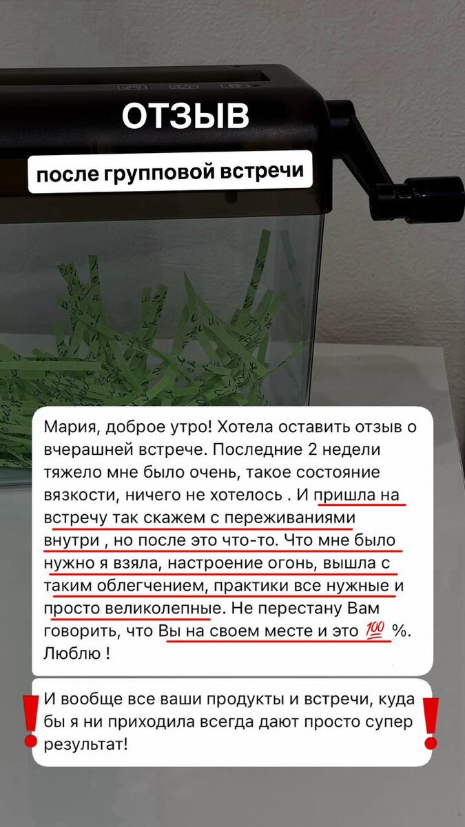 Всё так же 3 часа, всё так же с разных сторон мы подходим к заявленной теме. Меняюсь я, меняется моя концептуализация (я теперь умные слова знаю после курса по КПТ), меняются клиенты, которые приходят на эти групповые встречи — мы меняемся и растём вместе. Больше ни на каких своих проектах таких практик не даю (исключения — выездной тур, там нечто похожее). Спустя несколько лет индивидуальной и групповой психологической работы я наконец-то поняла, на какой встрече или на какой консультации что я даю и чем могу быть полезна. На таких групповых встречах это: ✔️во-первых, групповое поле, которое создается удивительным образом именно так, как надо каждому участнику именно в этот момент; ✔️во-вторых, это сочетание практик и техник, которые подсвечивают и показывают что-то с необычной стороны — не в каждом разговоре можно попасть на такую глубину; ✔️и в-третьих, это возможность узнать что-то новое, попробовать на себе и, возможно, что-то взять в свой арсенал поддерживающих домашних практ