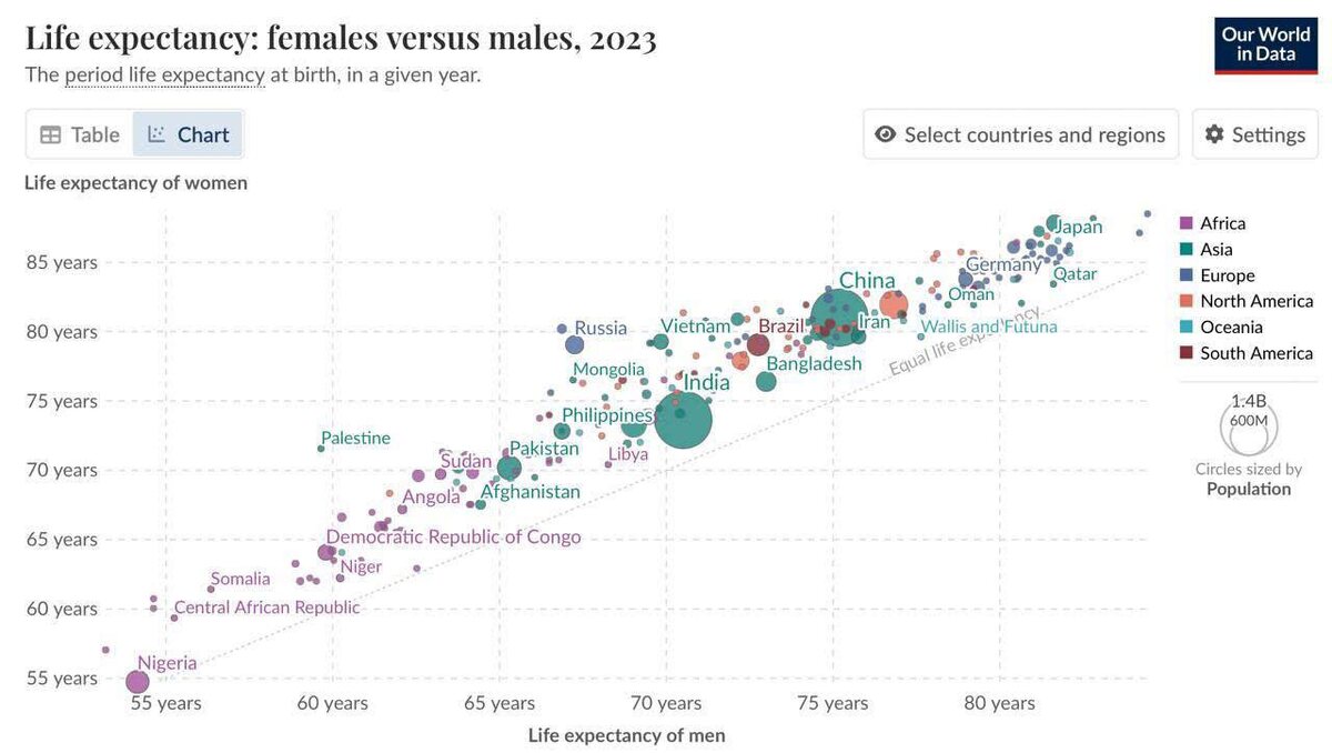 Интересно, будет ли также, когда речь пойдёт о неравенстве по отношению к мужчинам? Во всех странах мира мужчины (а также мальчики и дедушки) живут меньше женщин На графике показана ожидаемая продолжительность жизни для мужчин и женщин в 2023 году Разброс по странам довольно большой и зависит от уровня жизни и медицины Но во всех частях мира мужчины стараются поскорее покинуть его с билетом в один конец Особенно на сегодняшний день выделяются Россия, Украина и Палестина Мальчики любят соревноваться ещё с детства и уверенно лидируют в преждевременных рождениях и количестве заболеваний Не останавливаются они и в юном возрасте, чаще погибая от внешних причин А в старости их здоровье быстрее становится хуже, отчасти из-за большего злоупотребления алкоголем, курением и прочим Чемпионы по всем показателям! У такого разрыва, конечно, есть биологические причины Но социальные нормы их нередко усугубляют Мне кажется крайне несправедливым, что при значительно более короткой жизни мужчины поз