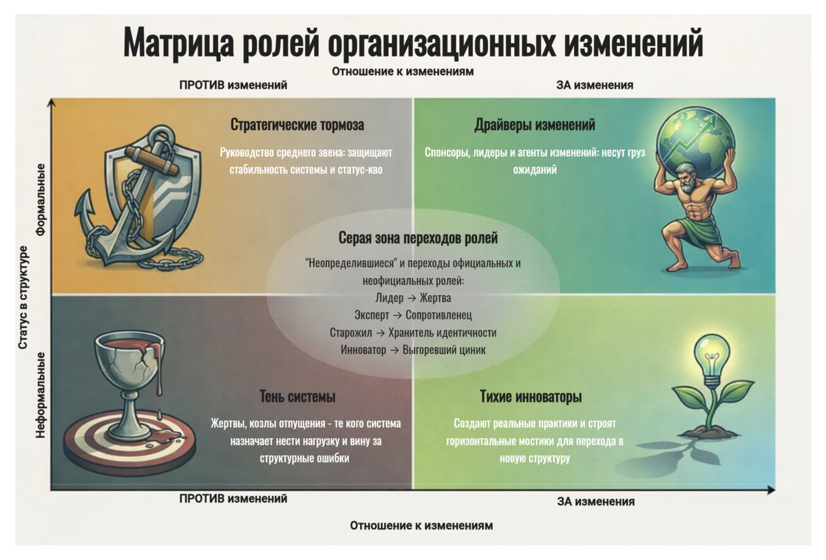 В реальности многие роли в организационных изменениях не фиксированы. Человек не «является» лидером, жертвой или сопротивленцем — он временно занимает эту позицию, потому что система нуждается в определённой функции.