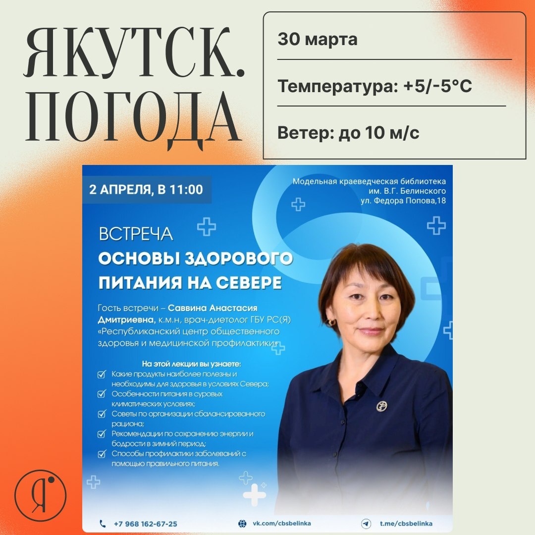 Полезная лекция, посвященная основам здорового питания в условиях Севера. В современном мире правильное питание — залог хорошего здоровья, профилактики заболеваний и повышения жизненного тонуса, особенно в суровых климатических условиях 🌬️ Гость: Саввина Анастасия Дмитриевна, к.м.н., врач-диетолог ГБУ РС(Я) «Республиканский центр общественного здоровья и медицинской профилактики» 🏥 📍 ул. Ф. Попова 18 🏫 Краеведческая библиотека им. В.Г. Белинского 🗓 2 апреля в 11:00 🎫 Вход: свободный 16+ 📱 Запись: +79681626725 Online Якутия | Ждем вас в МАХ