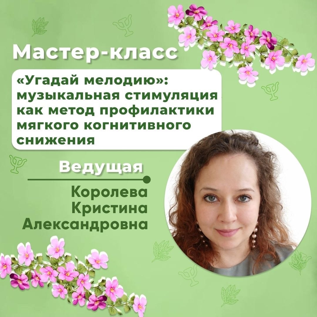 , есть уже планы и на осень, и на весну) Одним из выступлений станет участие с коллегами 4 апреля. Мастер-класс «Угадай мелодию»: музыкальная стимуляция как метод профилактики мягкого когнитивного снижения» 👥 Ведущие: — Емельянова Ирина Валерьевна — Королева Кристина Александровна — Назарова Елена Петровна — Солодкая Наталья Геннадьевна — Пименова Ксения Алексеевна 💌 Аннотация: мастер-класс посвящен представлению практико-ориентированной разработки, направленной на профилактику мягкого когнитивного снижения у людей пожилого возраста посредством музыкально-когнитивной стимуляции. В ходе мастер-класса участники: 1. Познакомятся с научным обоснованием использования музыки в профилактике когнитивного снижения; 2. Примут участие в демонстрационной версии музыкальной игры «Угадай мелодию»; 3. Получат представление о возможностях внедрения данного метода в образовательную, психологическую и геронтологическую практику. 🖇 Мастер-класс ориентирован на психологов, специалистов образован