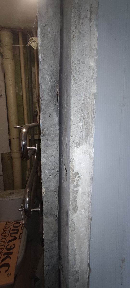 Панельная 5-и этажка, 1970 года. В ванной комнате помимо стены из бетонной плиты 50 см параллельно, почти вплотную, стоит ещё одна стена. Эта вторая стена (обозначена красным цветом) не плотная, осыпается от зубила с молотком. Явно не бетон. Как будто, плотная штукатурка с мелкими камнями. Смущает, что все остальные стены в квартире имеют толщину 100 мм, а именно эта парочка стен каждая по 50 мм, что в сумме дают 100 мм, такую же, как все остальные стены. Плита перекрытия стоит на этой паре стен центральной частью, не с края. Читал, что бывают сантехкабины, которые на этапе строительства вставляются целиком, таким образом получаются все двойные стены, а также двойной пол и потолок. Но с другой стороны санузла такой стены нет. и уровень потолка полностью совпадает с остальной квартирой - одна плита. Так что, не похоже на то, что у меня сантехкабина. Эта вторая стена стоит к бетонной не вплотную, есть опасения, что она упадёт/деформируется. Поэтому вторую стену в любом случае хочу демонт
