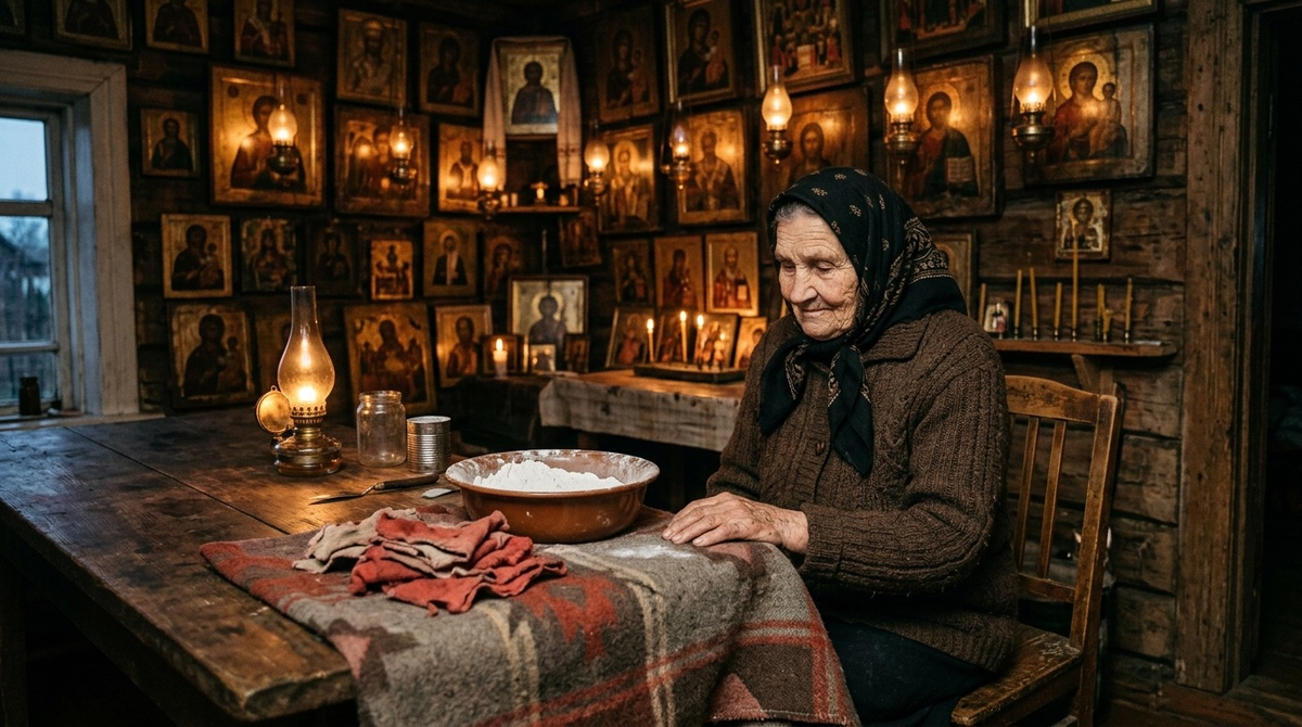 Вся стена была в иконах. Больших, маленьких, старых, тёмных. Перед ними теплились лампадки. В центре комнаты стоял огромный круглый стол – массивный, дубовый, накрытый пледом. Таким пледом, какими в советское время накрывали диваны. Ворсистым, выцветшим.